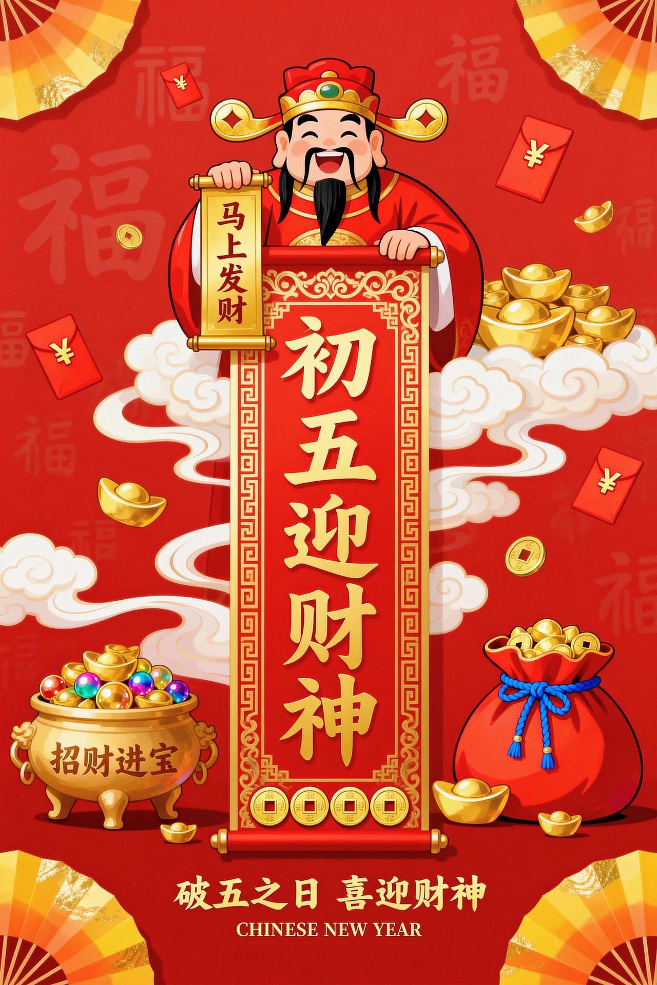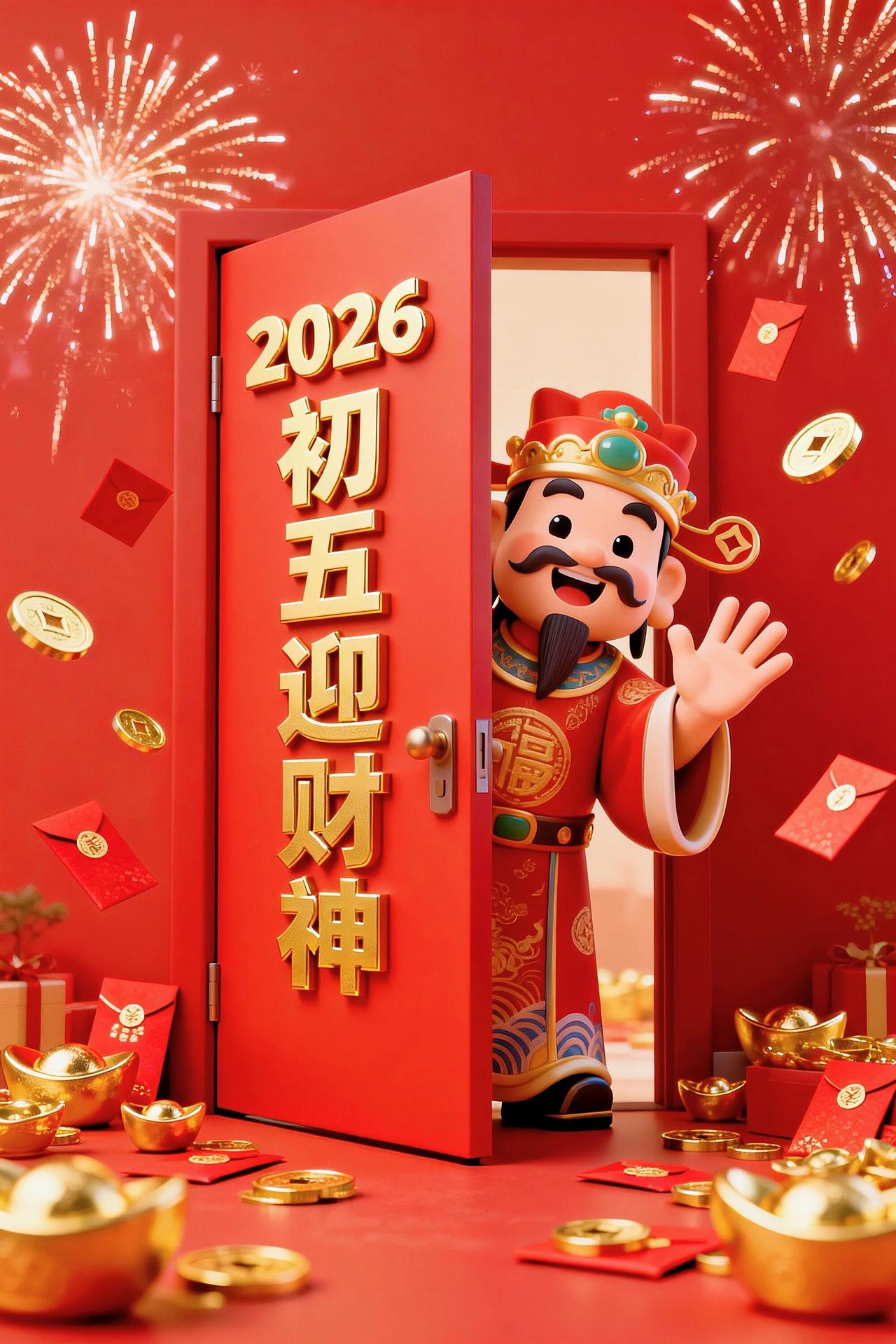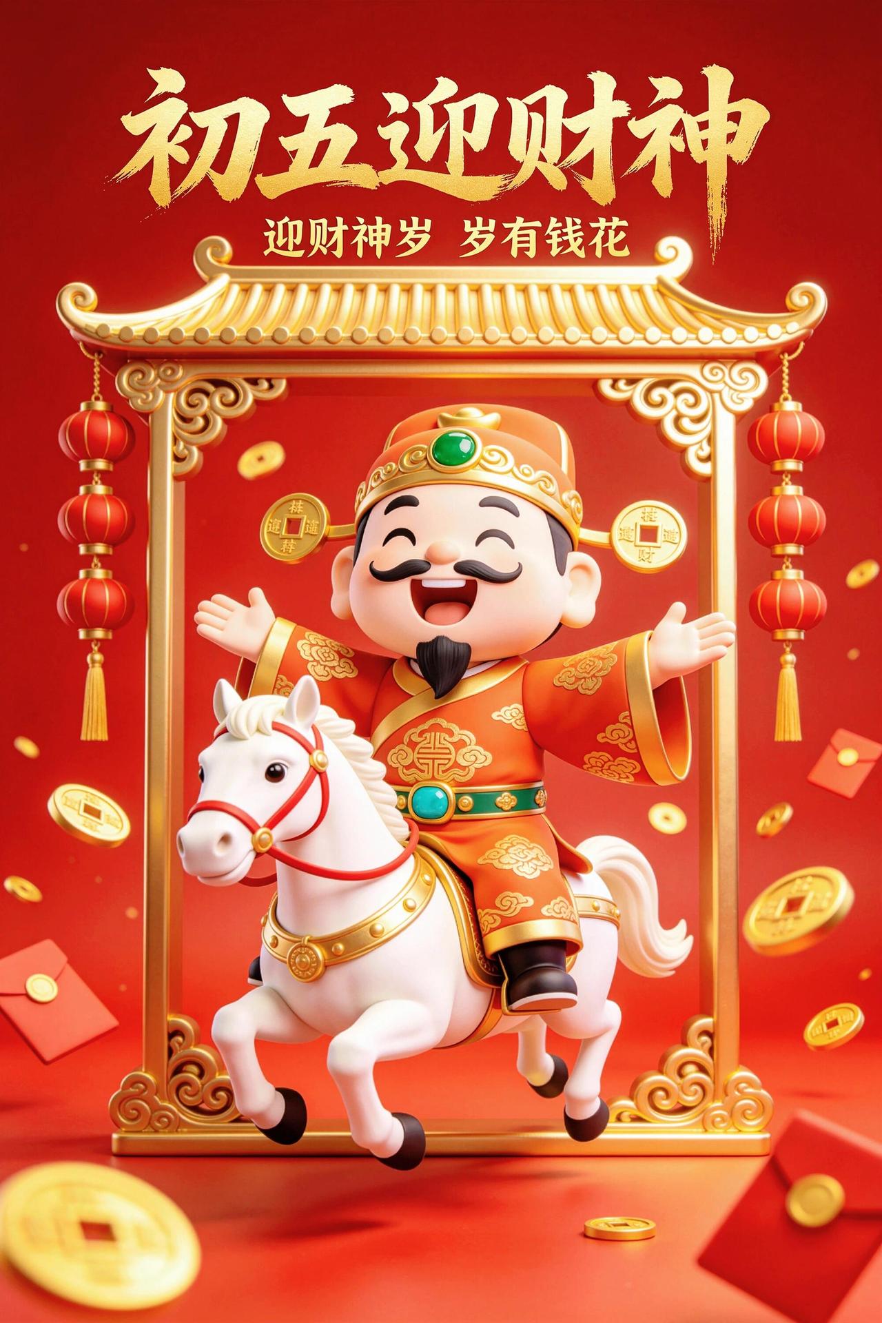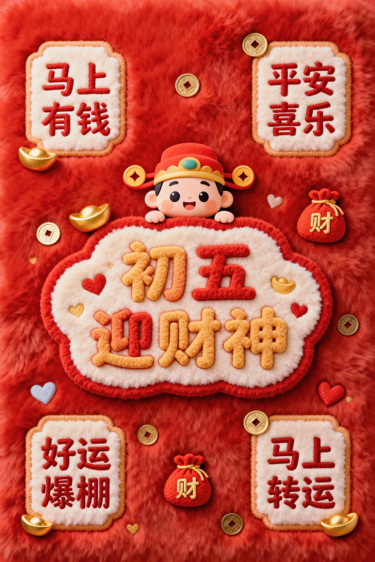 初五到,财神到,好运到!初五送你摇钱树,金银财宝往家数;马年送你聚宝盆,富贵满堂福气深;马年送你平安符,身体棒棒心里舒;马年收到祝福多,一路顺风万事和!祝你在新的一年里,福气连连,财运满满,健康常伴,笑口常开!🧧🐎