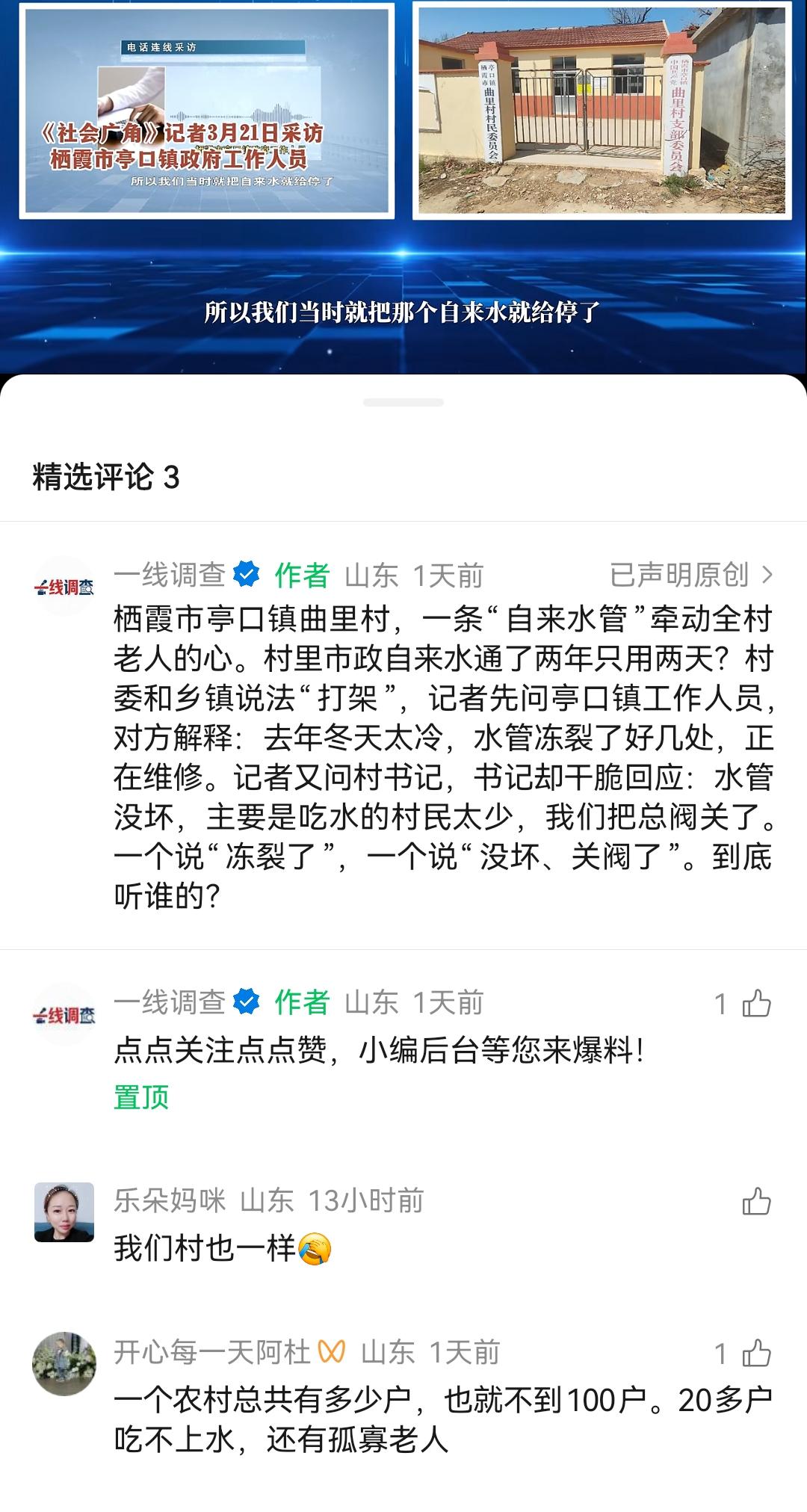 栖霞市亭口镇曲里村的市政自来水通了两年只用两天?村和乡镇说法“打架”,记者先问亭口镇工作人员,对方解释:去年冬天太冷,水管冻裂了好几处,正在维修。村却干脆回应:水管没坏,主要是吃水的村民太少,我们把总阀关了。一个说“冻裂了”,一个说“没坏、关阀了”。到底听谁的?