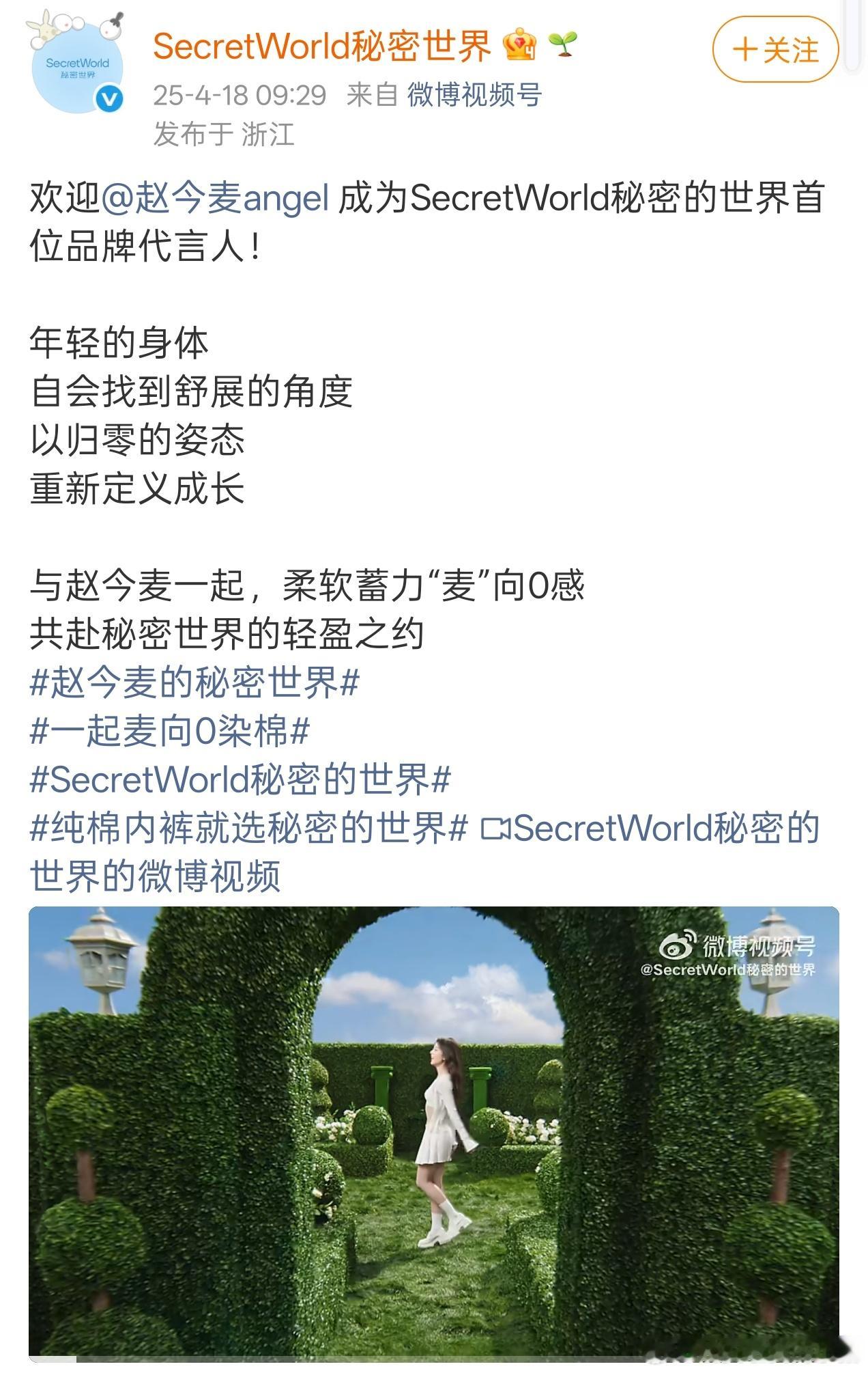 赵今麦秘密世界代言续约了,之前也是品牌首位代言人