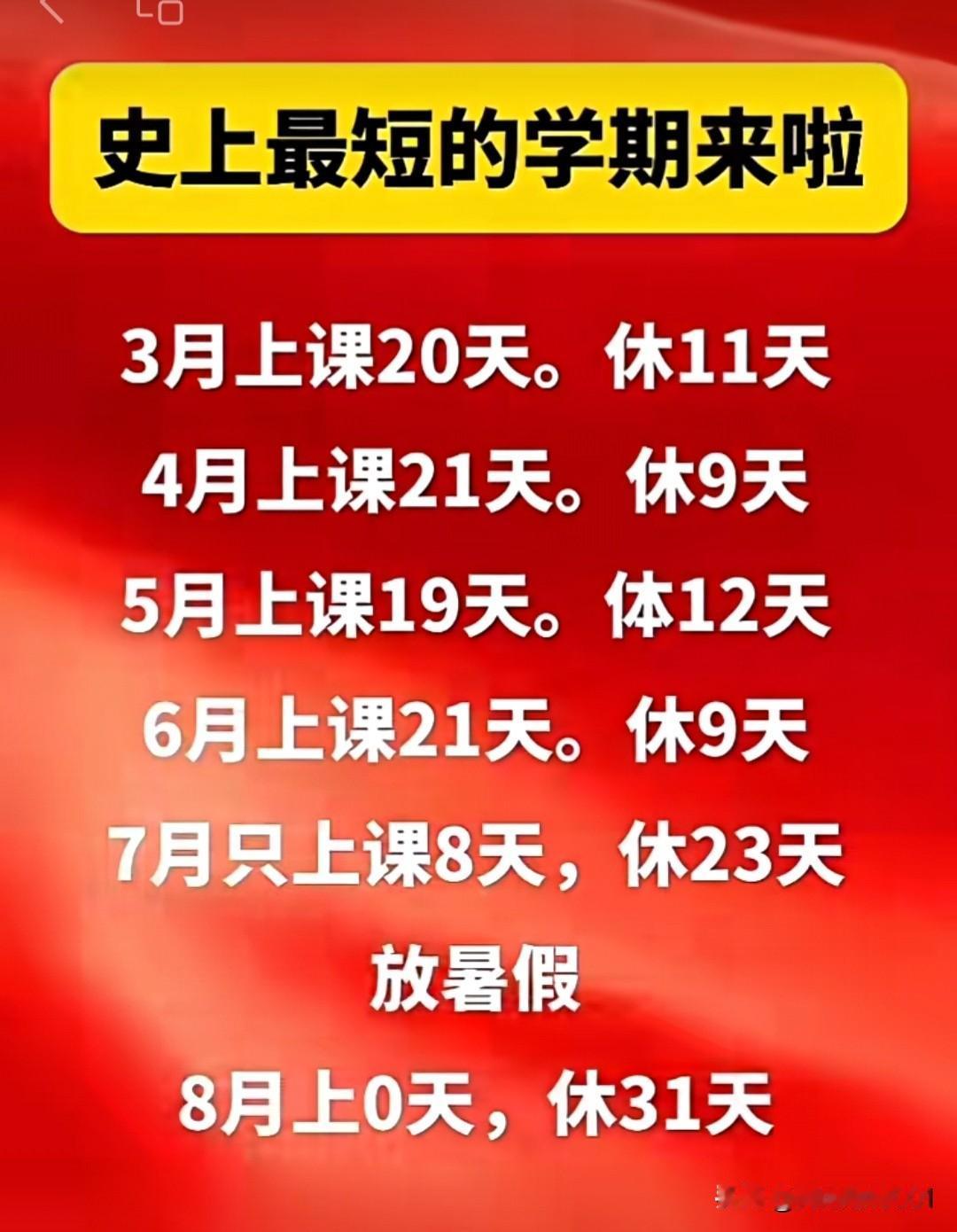 我点开小朱妈发给我的视频,看到第一个视频说的是秋假安排在今年的10—11月之间,时间是3天。第二个视频说的是这个学期是史上最短的学期,3月份上课20天,4月份上课21天,5月份上课19天,6月份上课21天,7月份只上8天课。