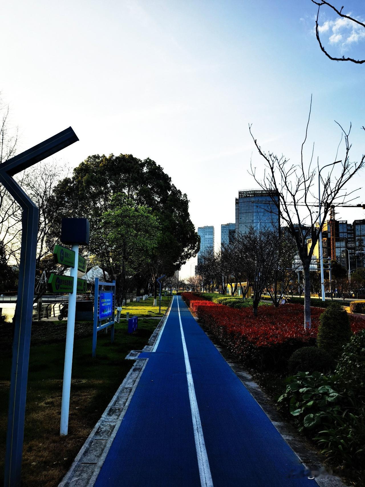 跑道是新铺的,色泽鲜明,上面标着距离,从这头到那头,沿着河,一直通向创苑路的大东江公园。路好,景也好,适合慢慢跑,也适合慢慢走,河边的柳条垂得很低,花还开着几丛,红的粉的,衬着远处楼群的倒影,在水里一漾一漾的。