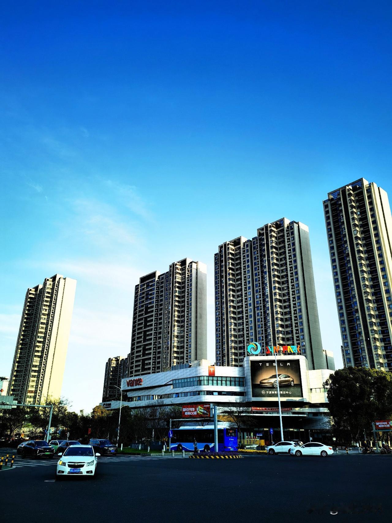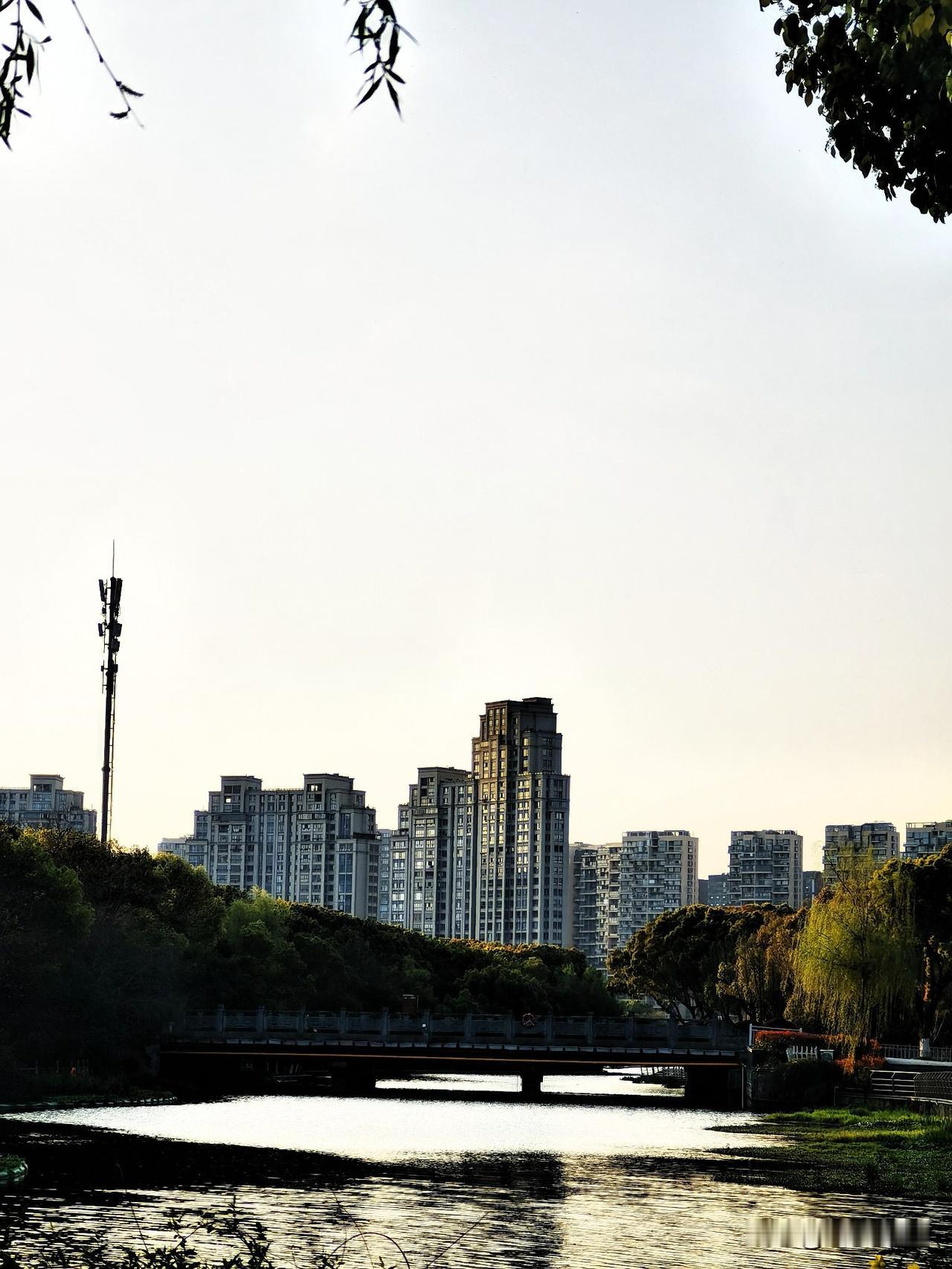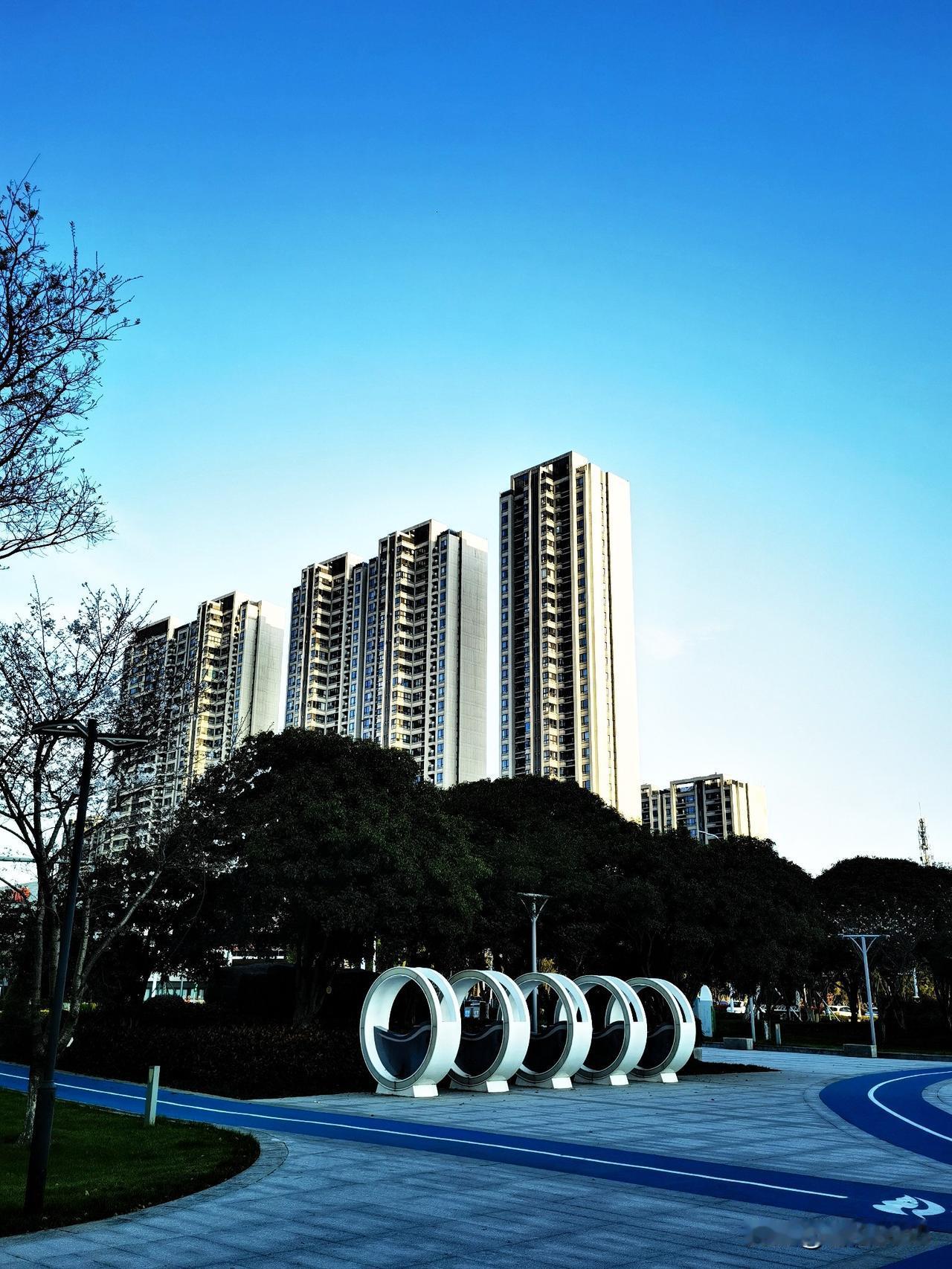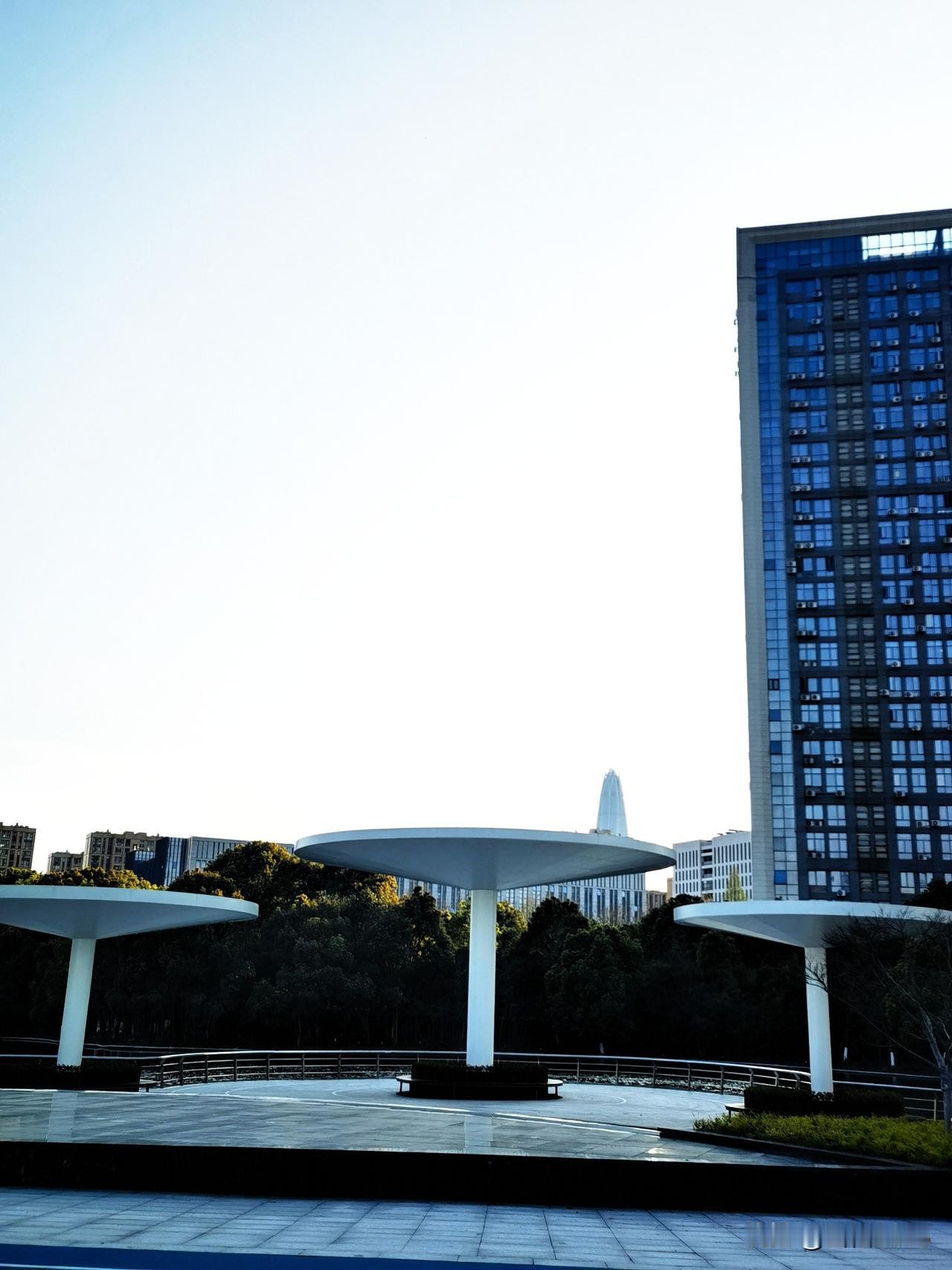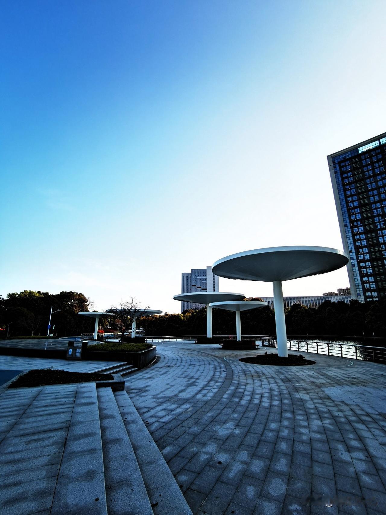 公园里有几座遮阳棚,像巨大的蘑菇撑在河边的广场上,投下圆圆淡淡的影子,旁边的楼房倒映在水里,被蓝天一衬,格外挺拔。