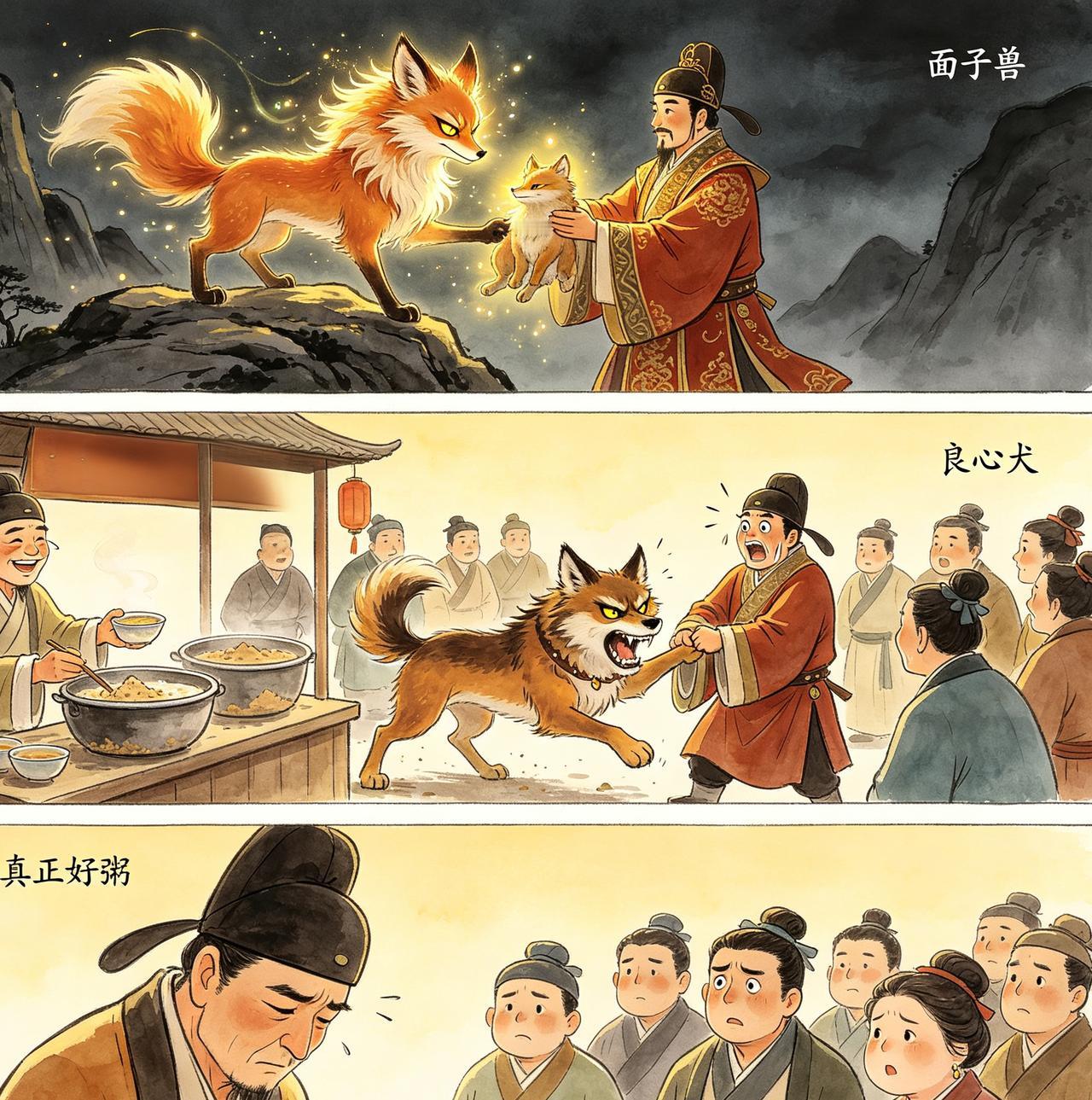 面子兽·肆:泰山有“面子兽”,形如狐,赠之可博虚名。员外得兽,日施粥博“善人”名,实则粥掺沙。后兽化“良心犬”,咬员外至施粥摊,逼其换真粥。员外惭,行真善,百姓皆感其德,方知“真心”二字,方能赢得尊重。