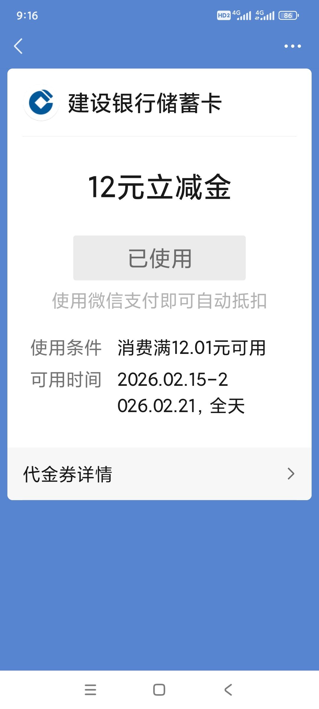 6.用微信购物付款时,就会自动显示有建行的优惠券,你可以使用了。