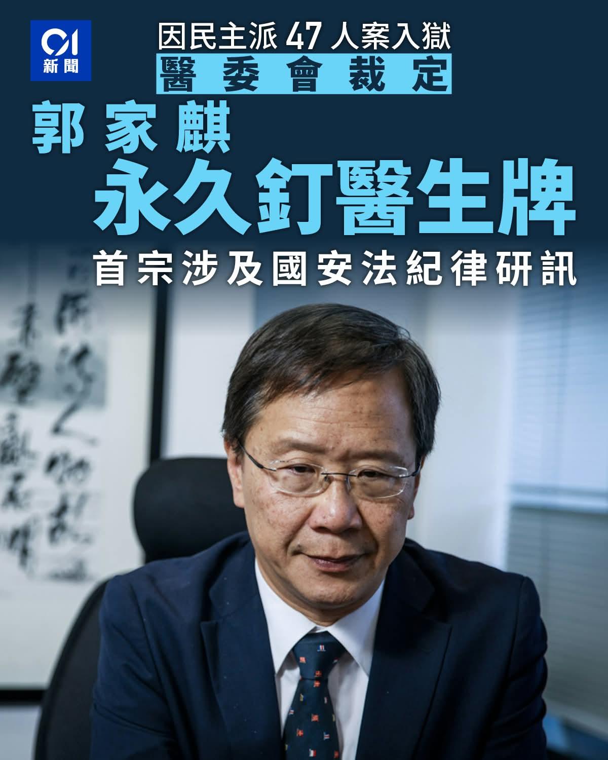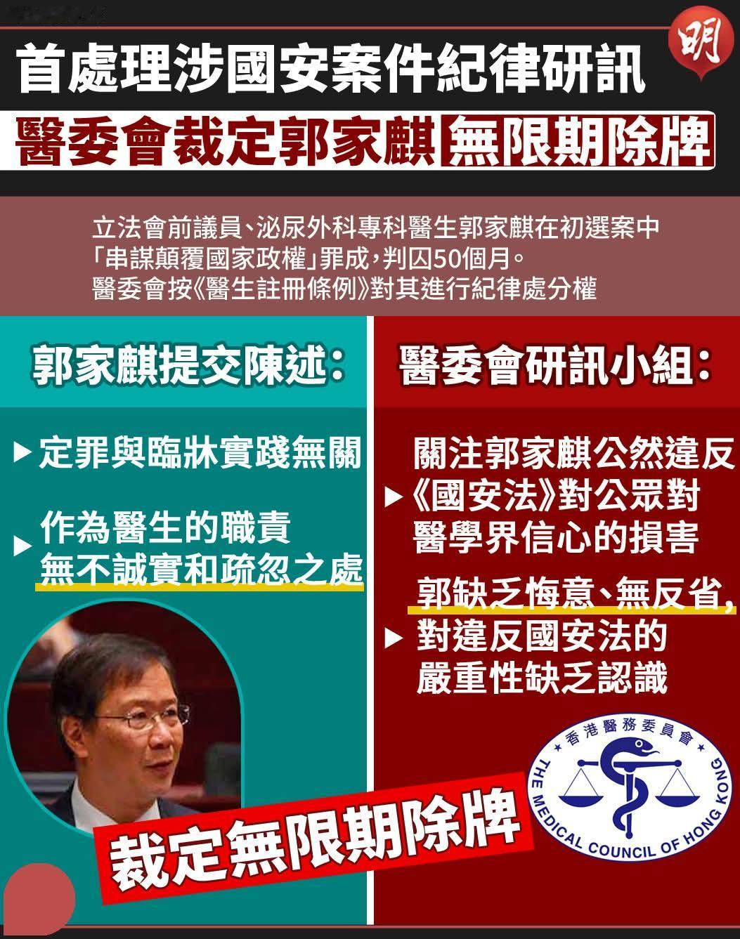 「35+串谋颠复政权」案,45名罪成被告于2024年被判处4年2个月至10年监禁。当中判囚4年2个月,已于去年4月刑满出狱的前立法会议员、泌尿外科专科医生郭家麒,昨日被医务委员会裁定从医生註册中无限期除名。这是医委会首宗涉及触犯国安法的纪律研讯。医委会更明确指出,郭家麒的陈述内容显示他缺乏悔意,也谈不上改过自新,亦对违反国安法的严重性缺乏认识。