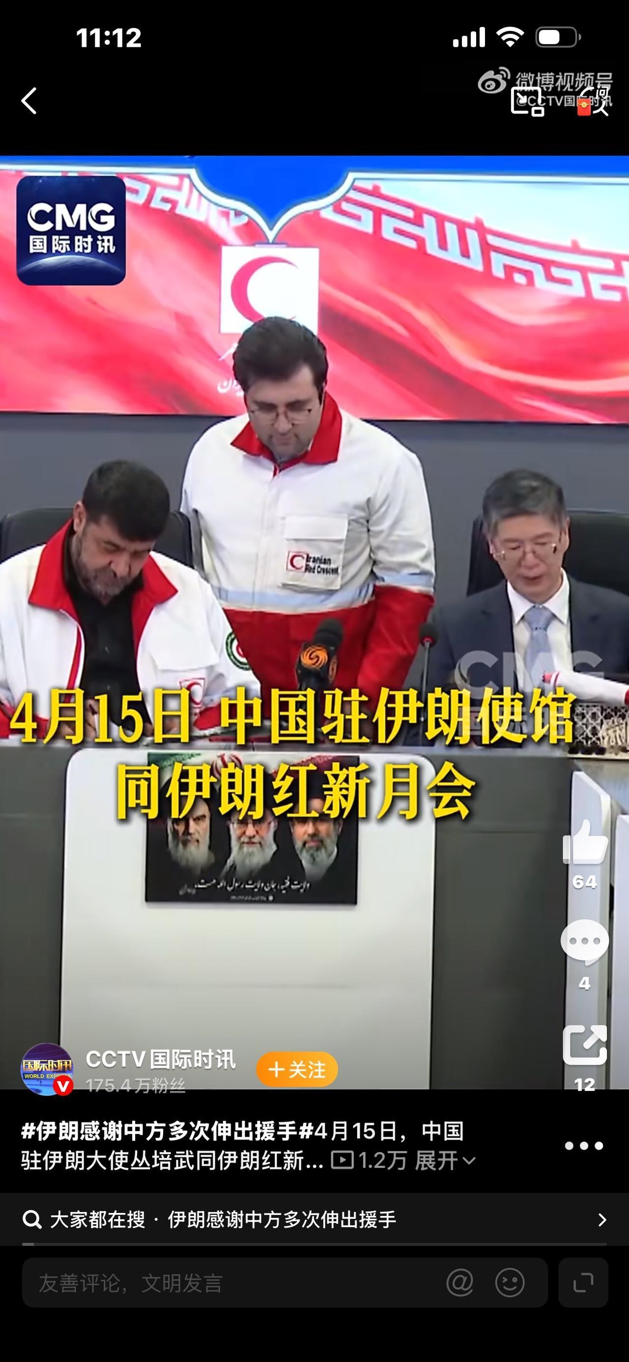 中国驻伊朗大使明确表态:中方始终心系伊朗人民,这是践行人类命运共同体理念、履行国际人道主义义务的生动实践。