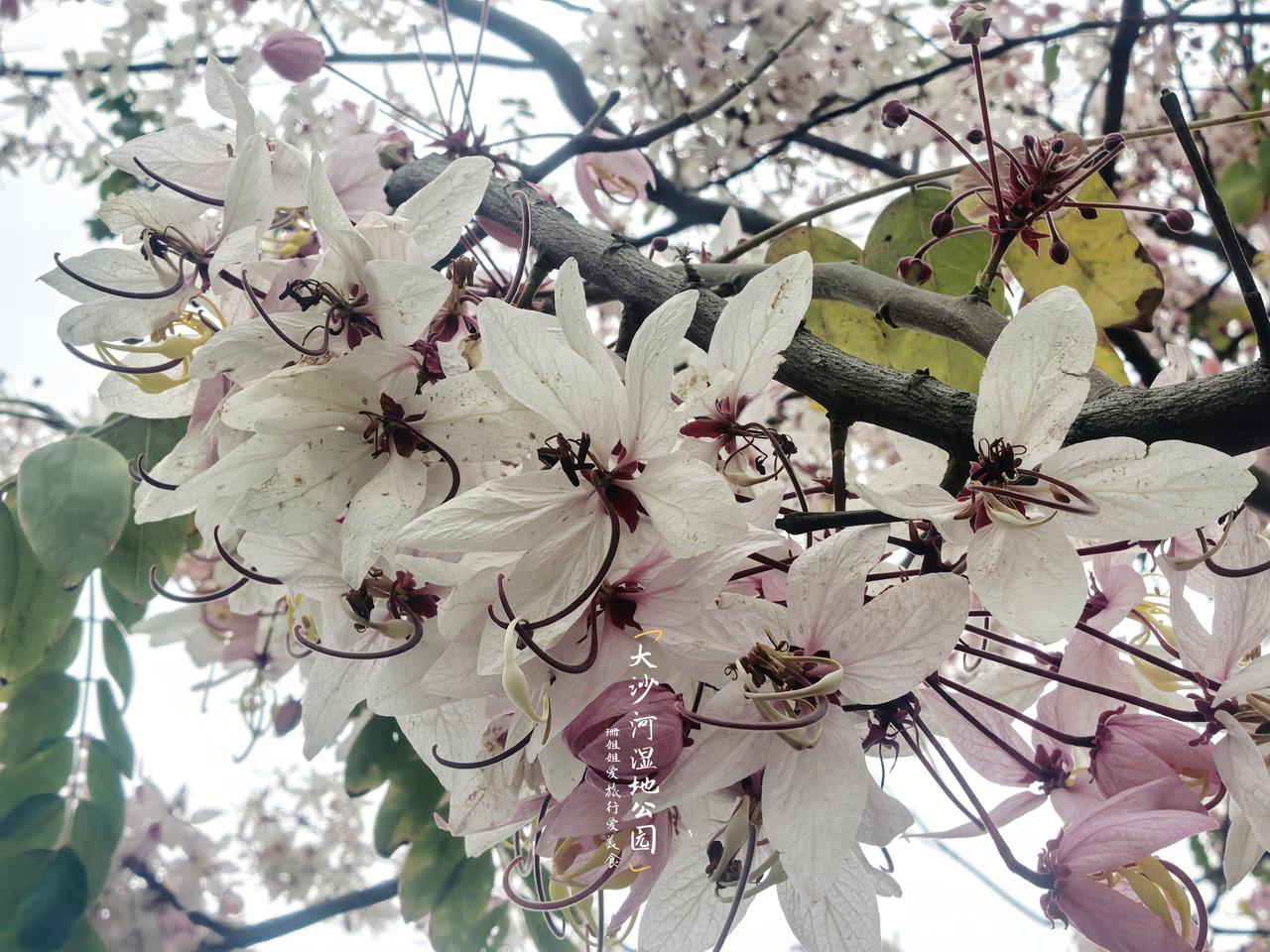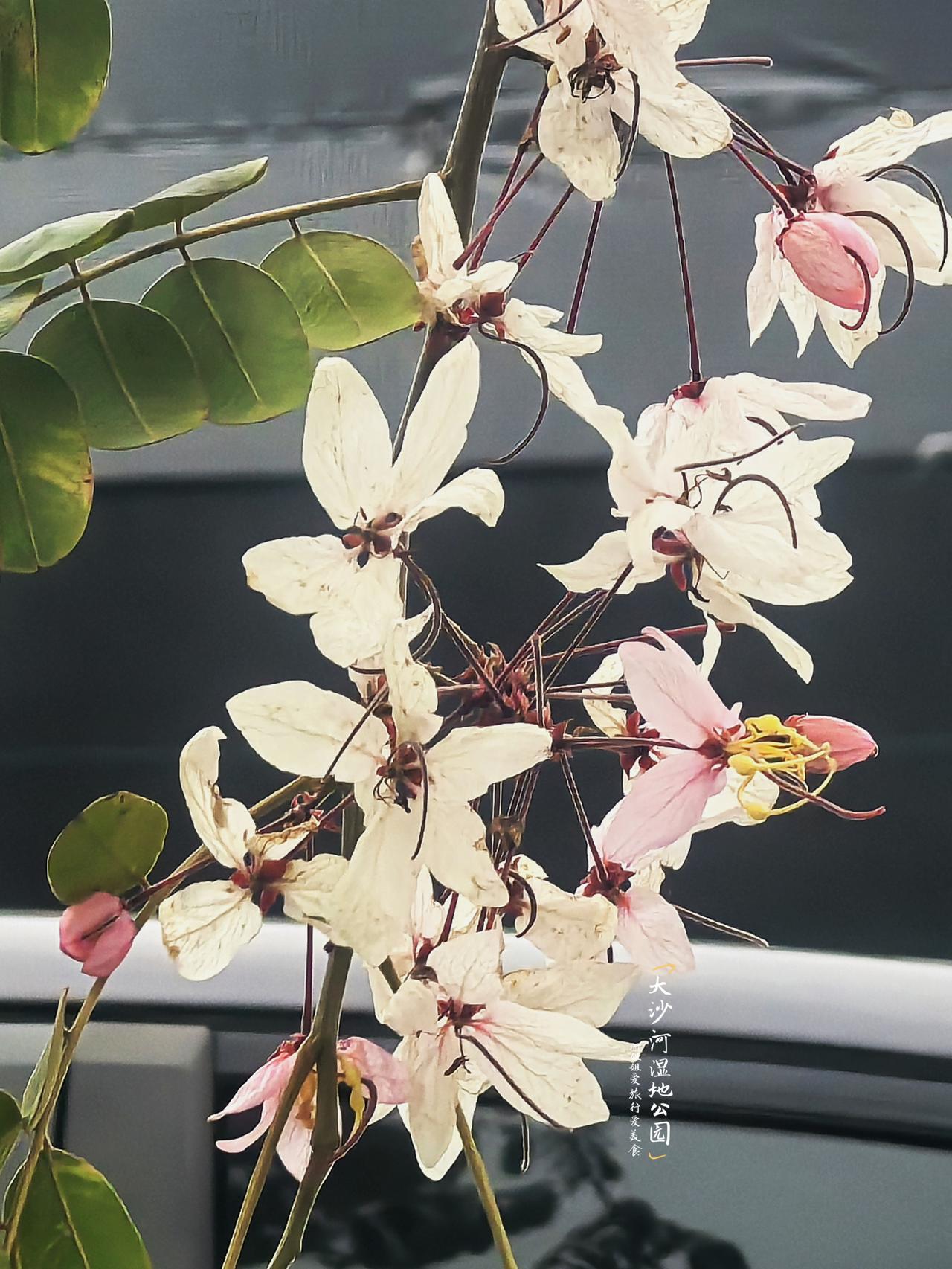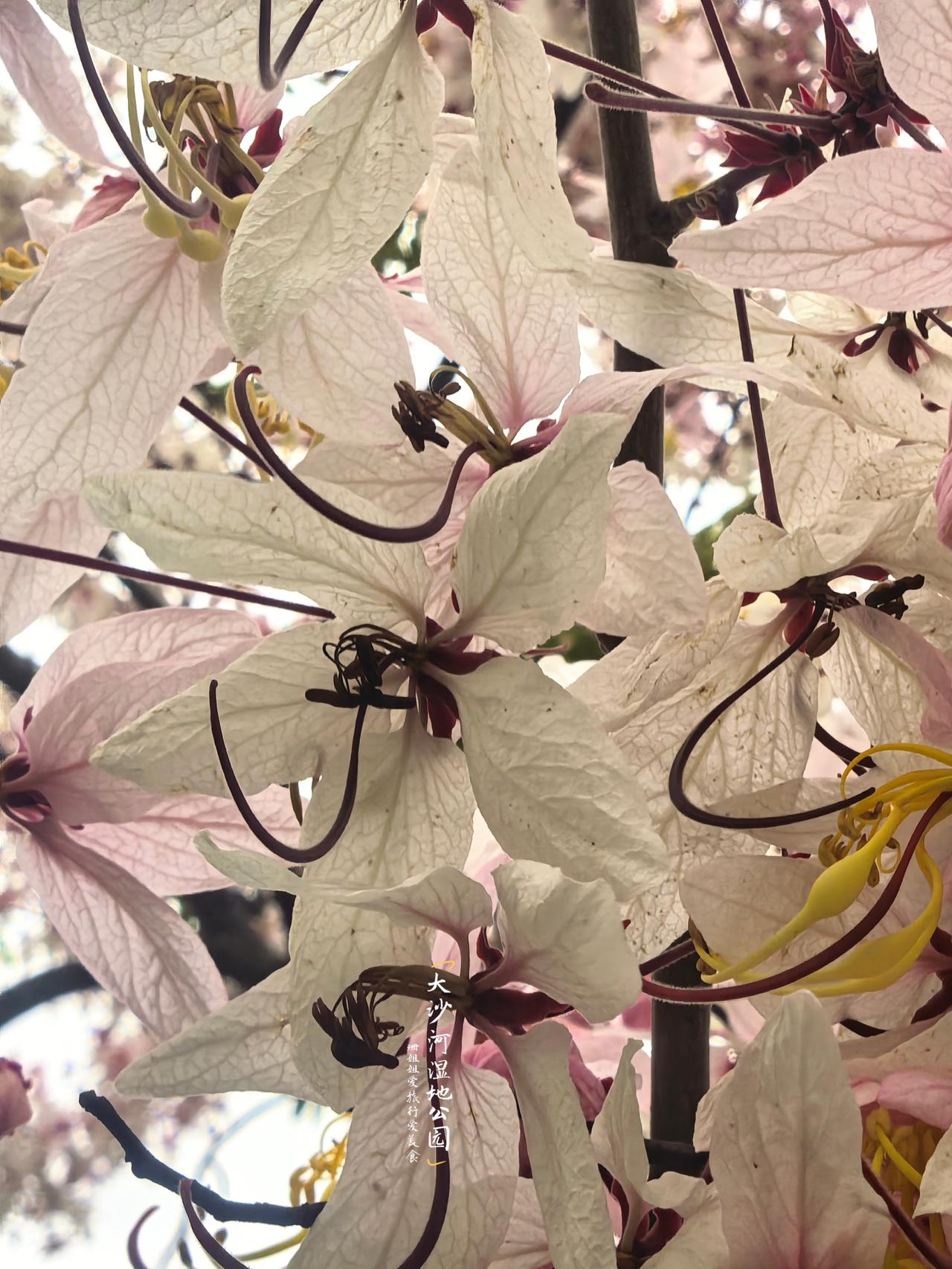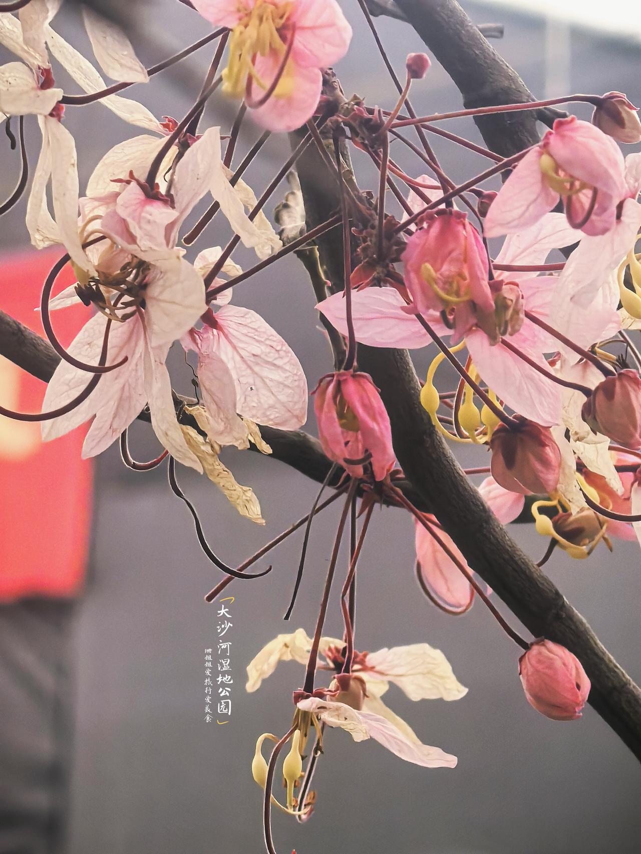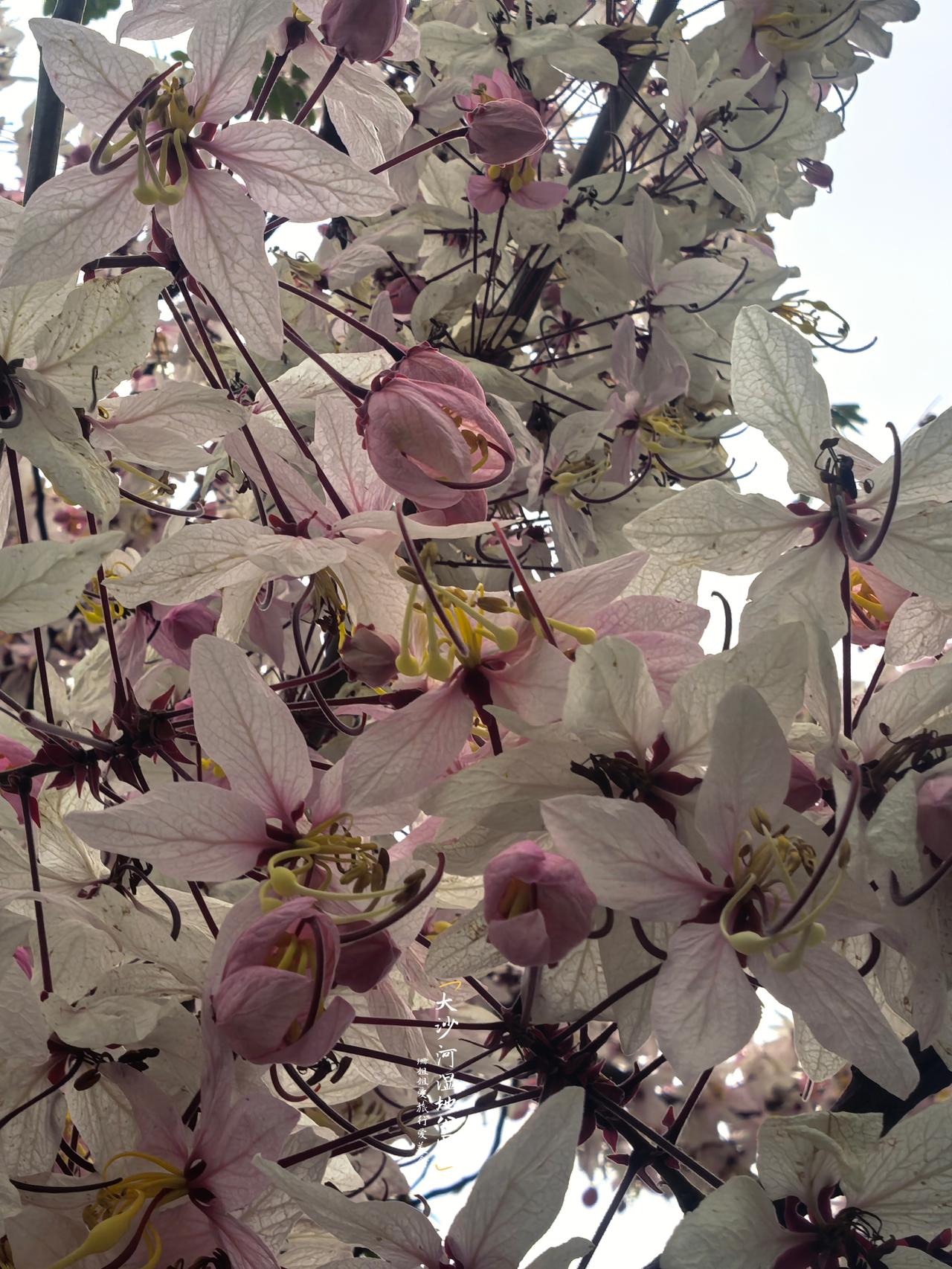 大家口中的泰国樱花,又称绒果决明,属于豆科决明属植物,原产于泰国、缅甸,并非传统樱花。花朵初开时白里透粉,慢慢转为柔媚的粉红色,花蕊带着淡淡嫩黄,繁花满枝垂坠枝头,远远望去就像粉色云霞,花期长达45天左右,每年3-4月是最佳观赏期,现在正是盛花期,赶紧冲!
