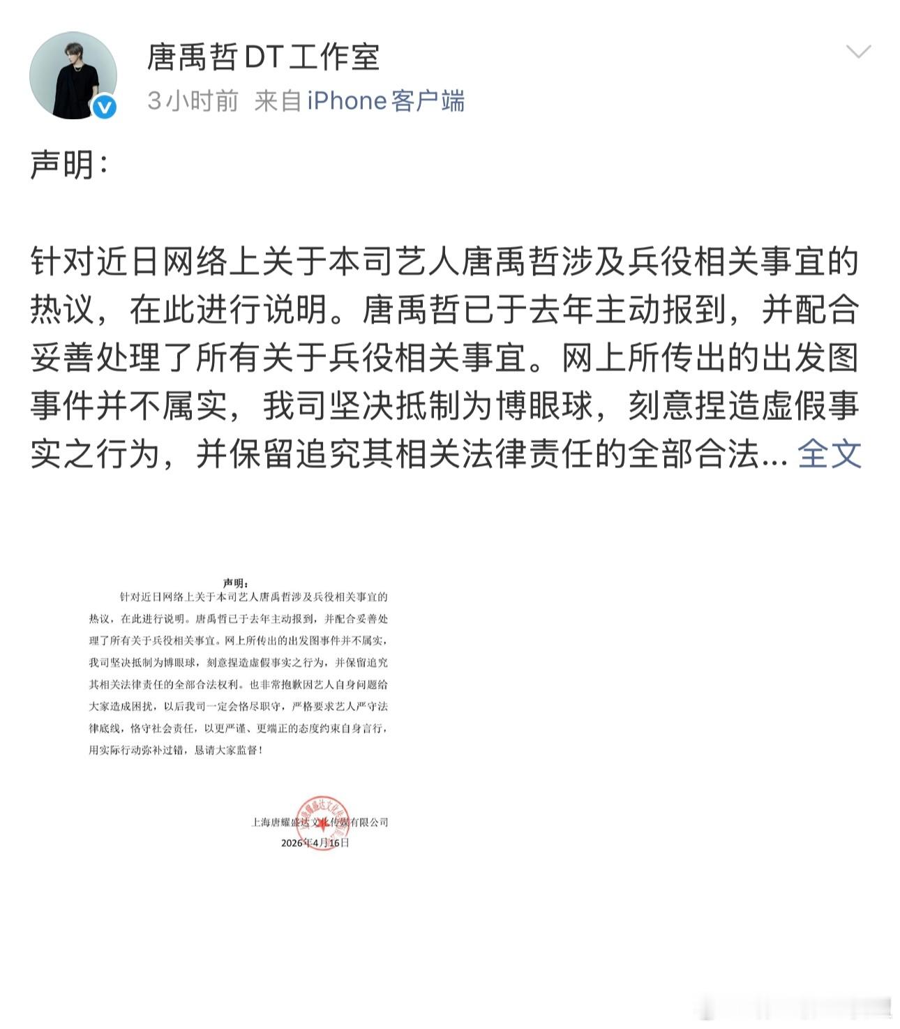 唐禹哲工作室声明刷到唐禹哲的瓜,工作室已经回应:不实信息已澄清,事情已妥善处理。