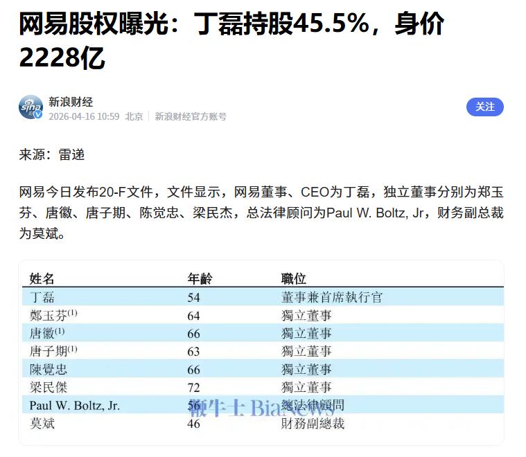 互联网消息指出,网易近期发布的20-F文件透露了公司内部的持股比例。如截止到2026年2月28日,丁磊共持有1,450,300,000股,持股比例为45.5%,为绝对的大股东。