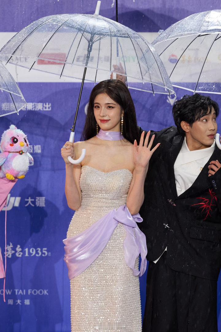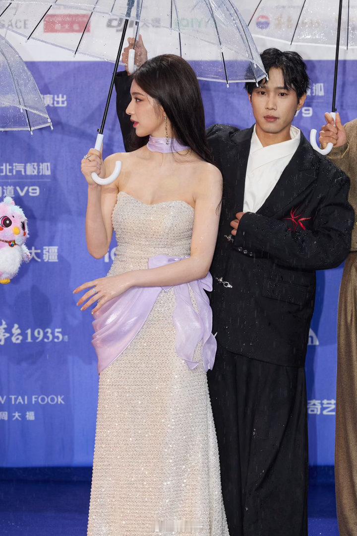 钟丽丽被雨淋了 北影节红毯突然下雨,她站的位置尴尬,撑伞会碰到旁边的人,干脆收了伞自己淋着。雨打在脸上,她用手挡了挡,还笑着。这个画面比精修图好看。钟丽丽红毯被淋了