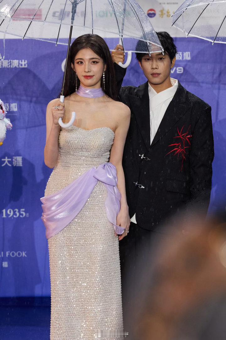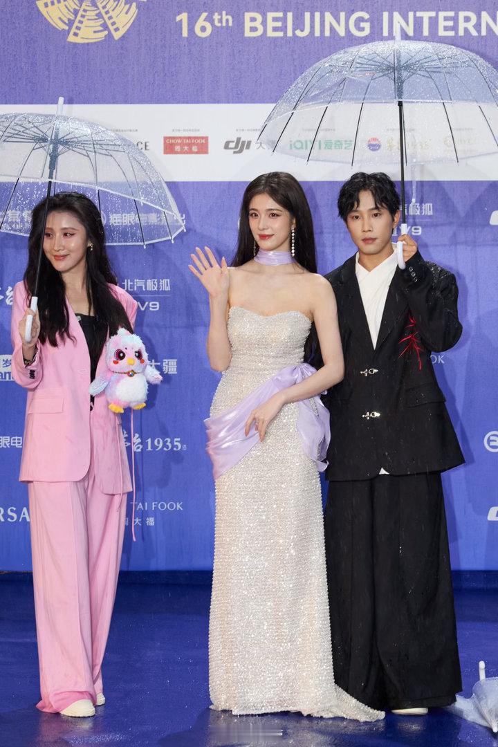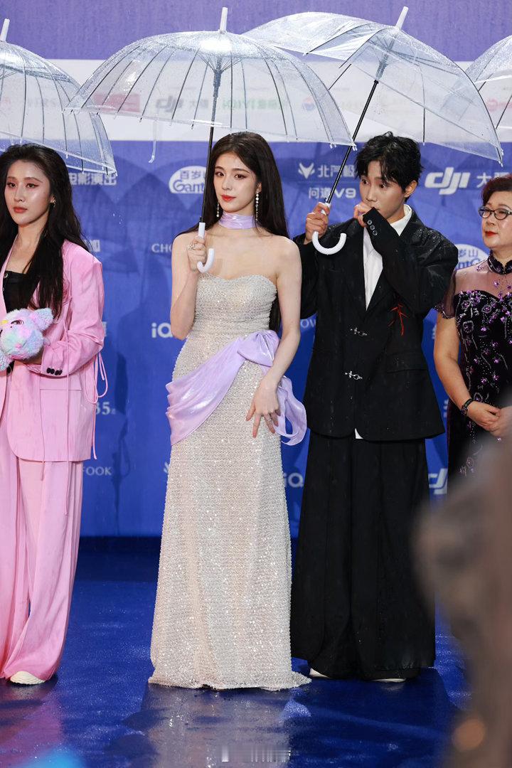 钟丽丽被雨淋了 北影节红毯突然下雨,她站的位置尴尬,撑伞会碰到旁边的人,干脆收了