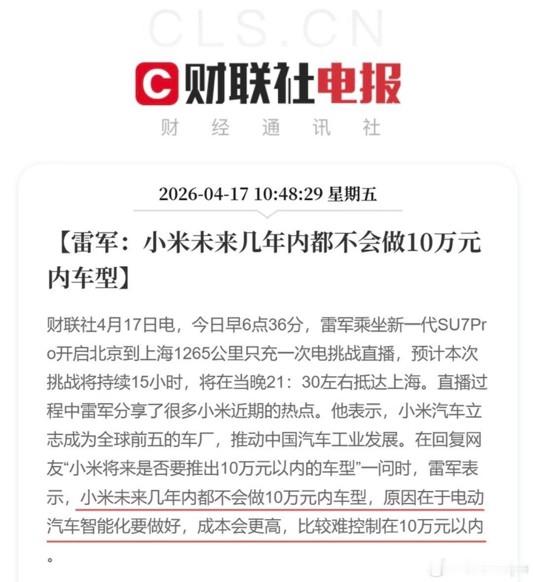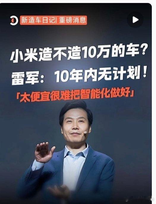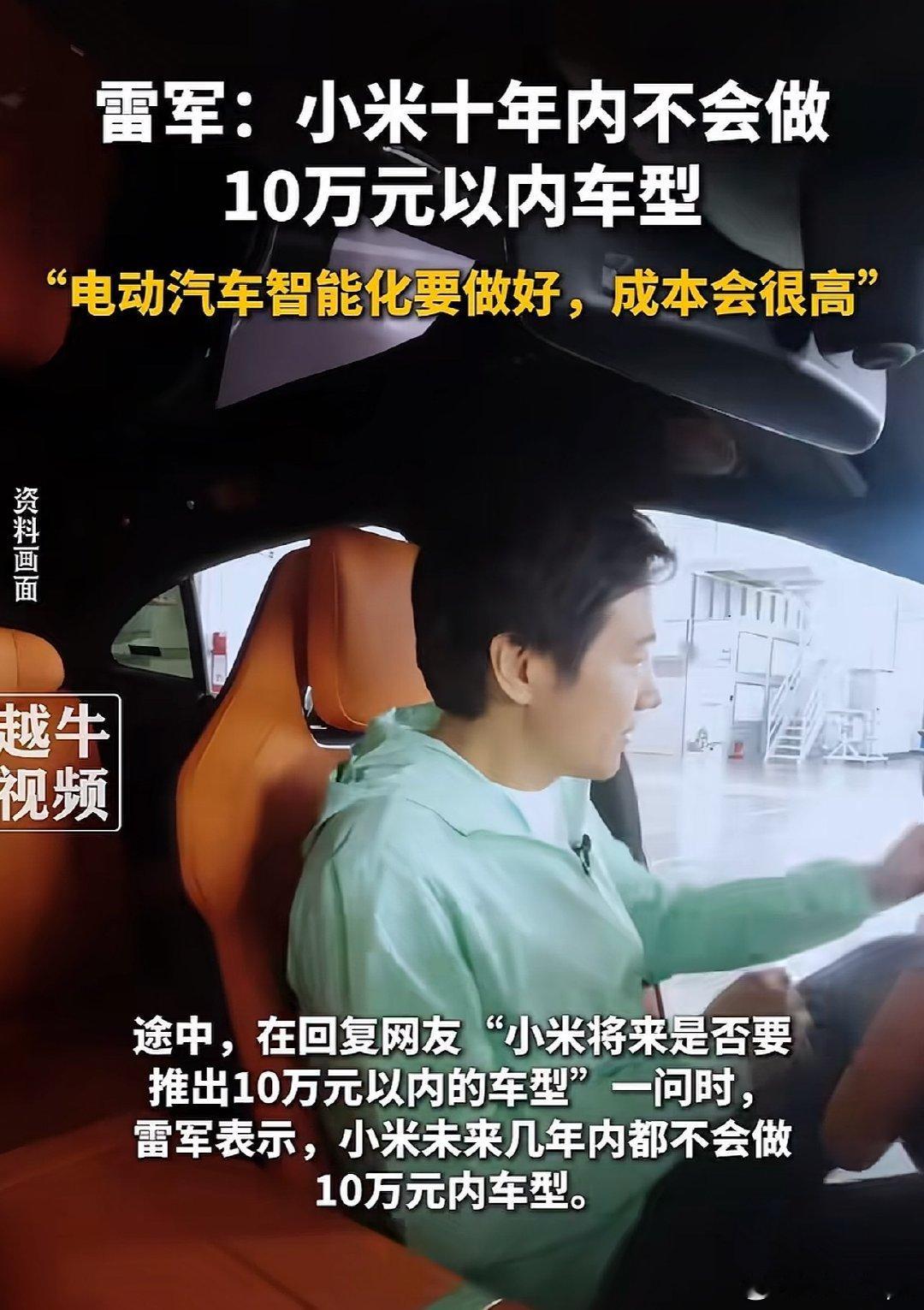 雷军回应是否做10万以内车型虽然零跑、比亚迪、吉利、五菱长舒口气 但不代表小米不