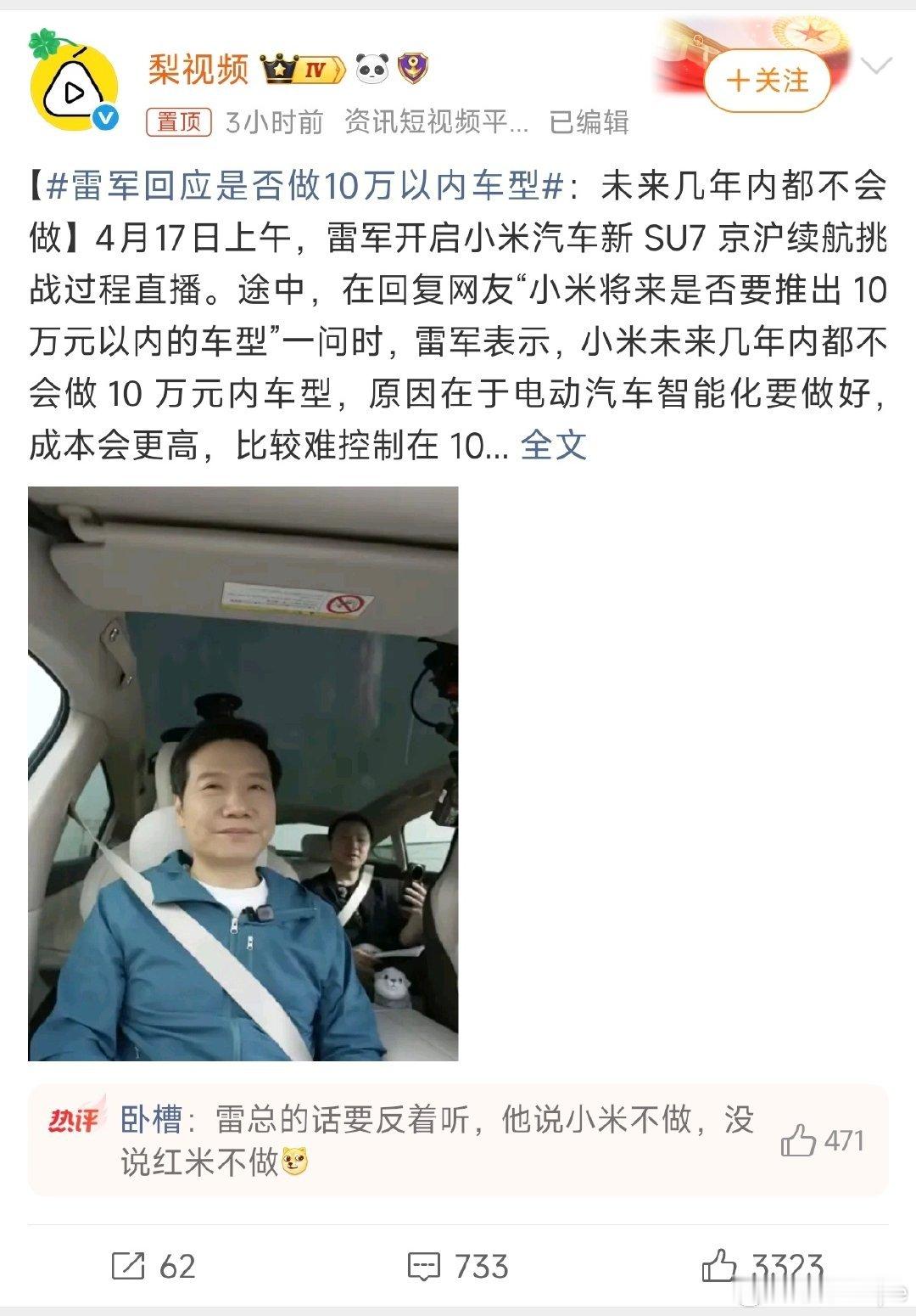 雷军回应是否做10万以内车型虽然零跑、比亚迪、吉利、五菱长舒口气 但不代表小米不做,红米不做民间艺术观察大v聊车汽车资讯汽车新能源汽车新一代SU7