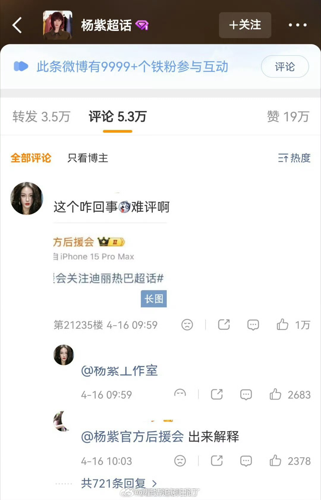 面对杨紫后援会和迪丽热巴近期的争议,杨紫工作室上线后换了头像~之前紫粉还是前排,