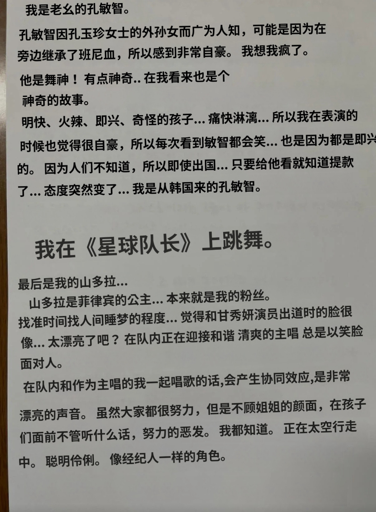 她声称CL是舞台表演的神,即兴表现超强,自带帅气气场,孔敏智舞台利落爽快,一出场就能带动全场气氛,朴山多拉则像“菲律宾公主”,嗓音清新漂亮,性格拼命努力。