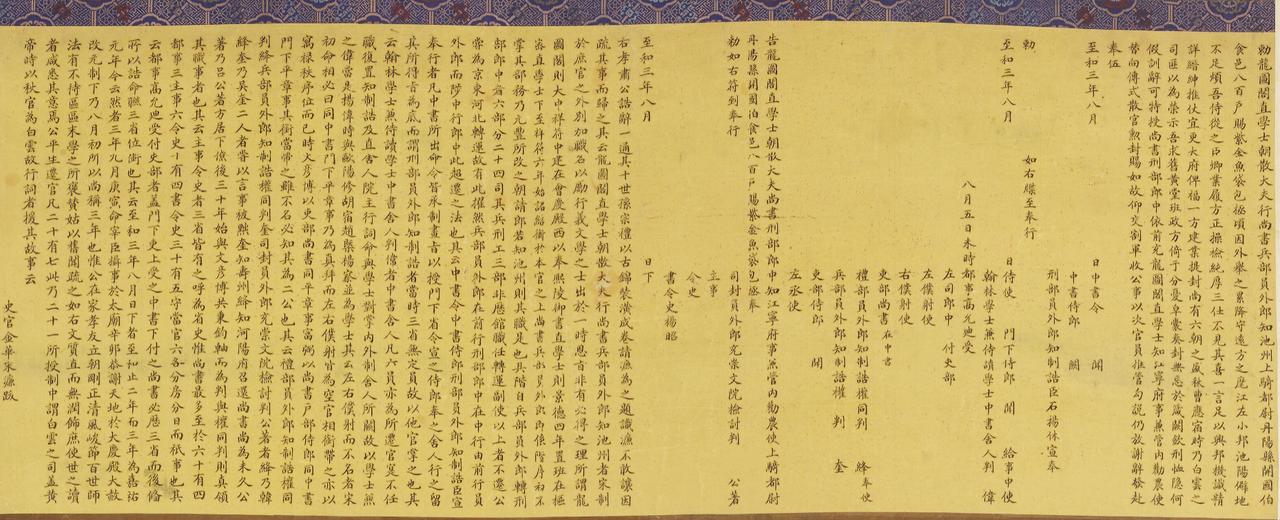 这幅《包公像》是什么时候的?按照图上方文字,至和三年是宋仁宗的年号,可是文件中的官员都没有签押,这不符合宋制啊。另外,包公所执的象牙笏板体量是不是太大了一点?请各路高僧指教!