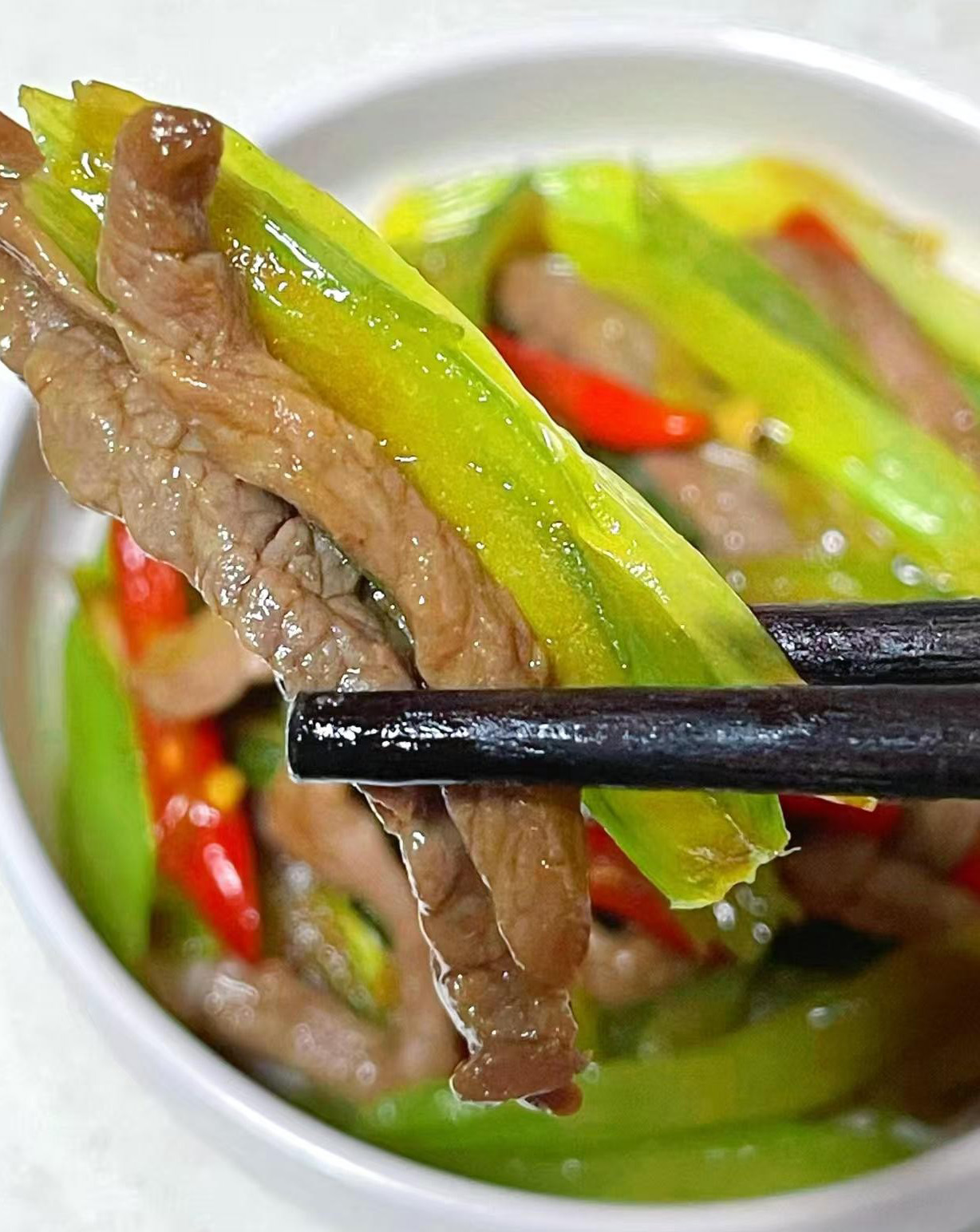 芹菜切斜刀片;牛肉切丝,加生抽、盐、糖腌制 20 分钟