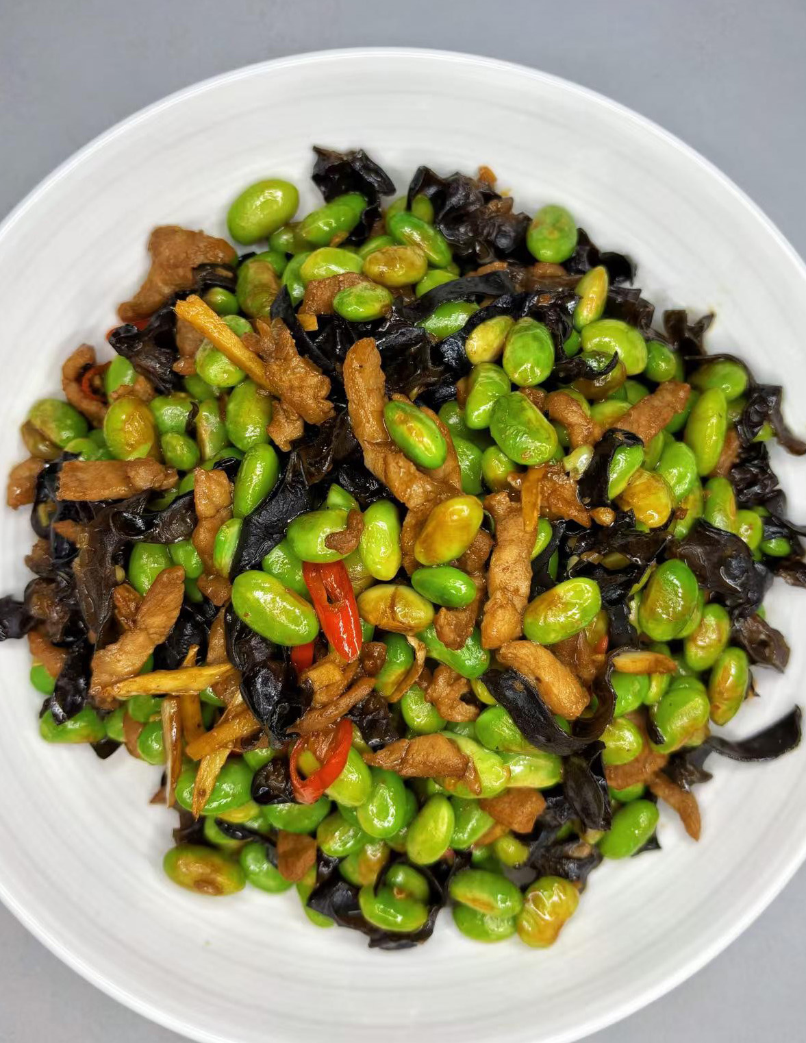 下木耳丝翻炒,倒入毛豆,加盐、生抽、蚝油、味精调味出锅毛豆和木耳富含膳食纤维,搭配高蛋白肉丝,清肠补营养,给免疫力添助力!