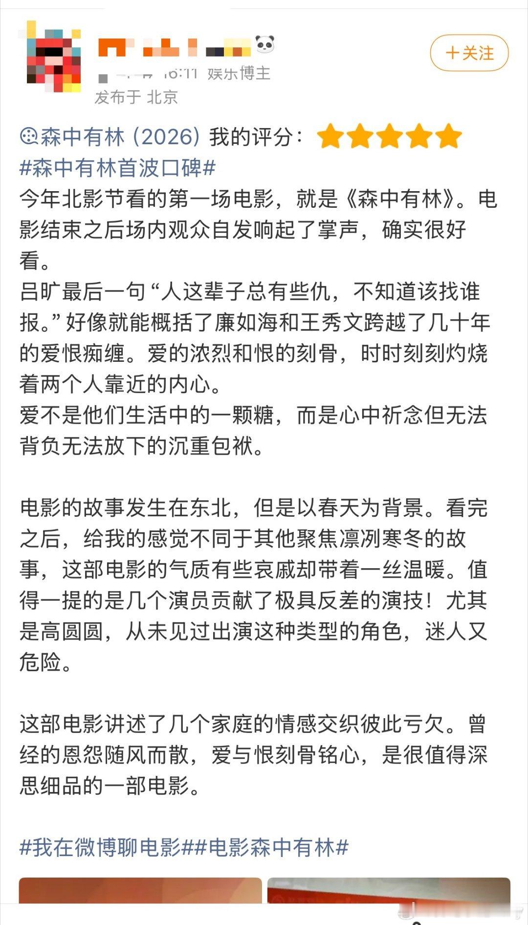 森中有林首波口碑果然只有作者才最懂自己的作品,《森中有林》首波好评不断,从小说到电影,完成了真正的“升级”。一命抵一命,这事能了不?看起来非常罪,特别狠,于和伟高圆圆cp感太强了,熟男熟女拉扯感好足,法拉利和法拉利车主即视感,中年意难平之间隔着的是杀女之仇,这才是真正的恨海情天啊,好虐好爱看,期待导演郑执 ,《森中有林》五一大银幕见!