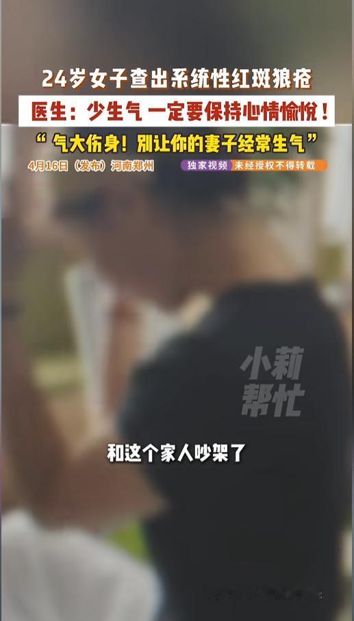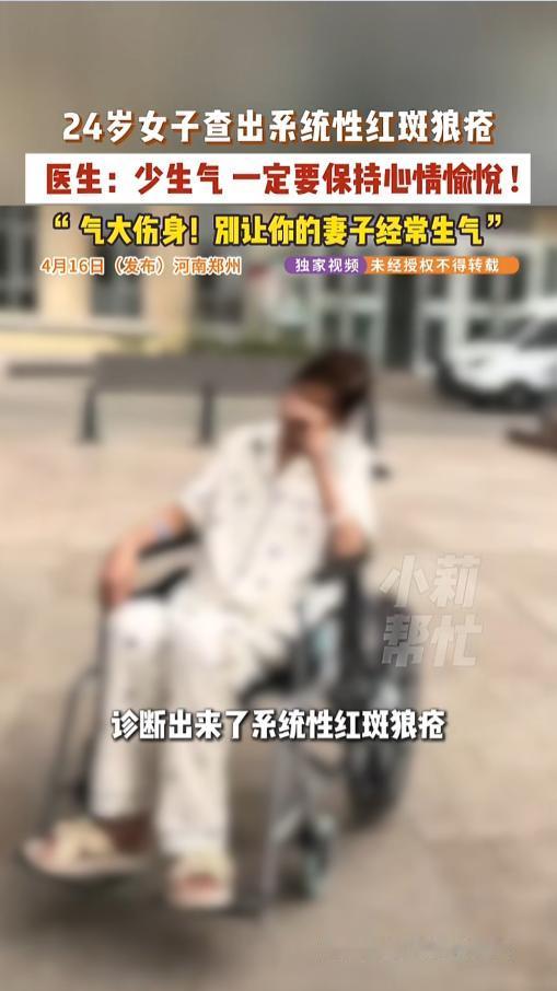 信息来源:《第128集:4月16日(发布)河南郑州,24岁女子查出系统性红斑狼疮,医生:少生气,一定要保持心情愉悦!”气大伤身!别让你的妻子经常生气“。》小莉帮忙