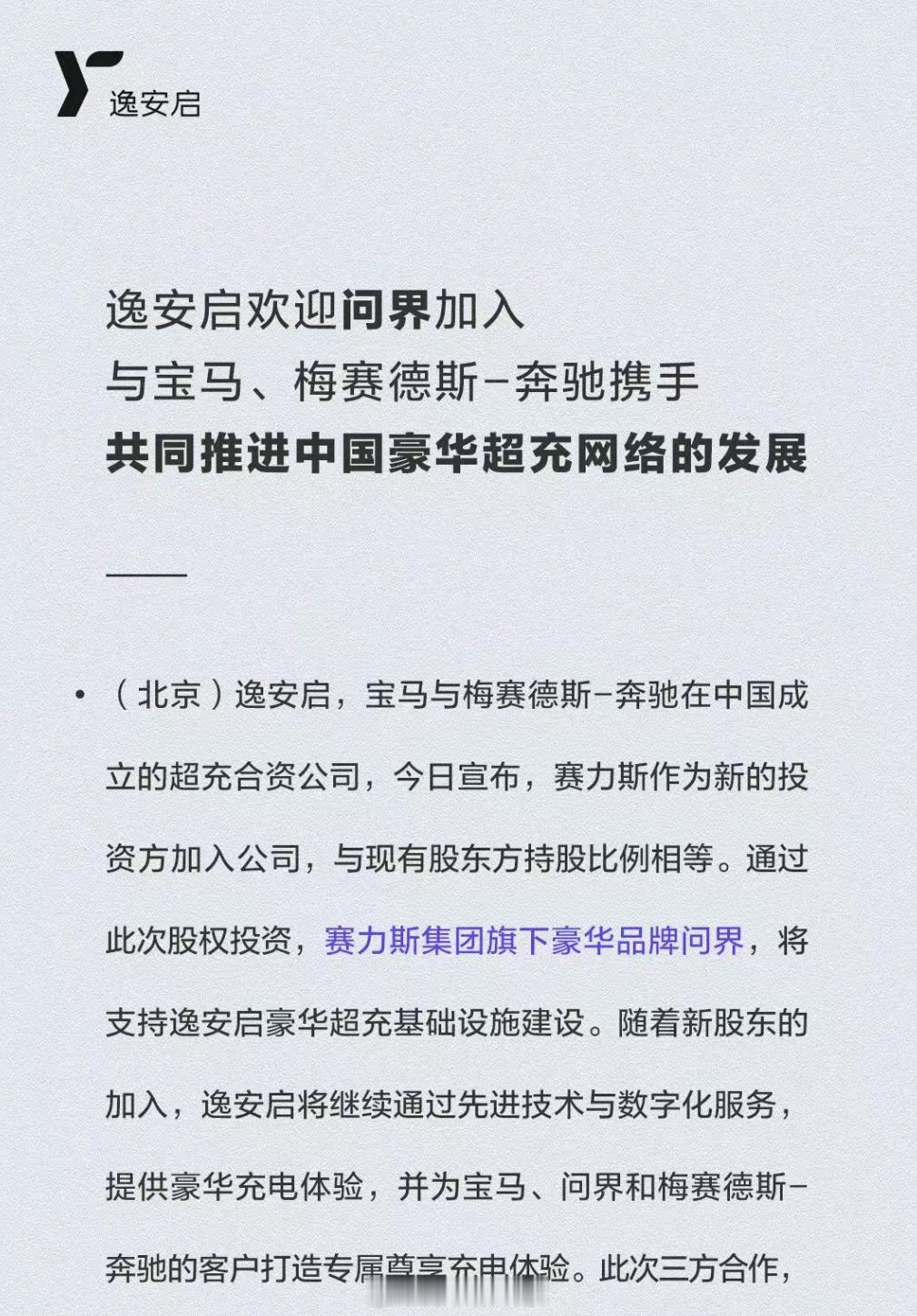 问界搞新玩法了,加入宝马和奔驰共同创立的超充合资公司逸安启,各自持有33.3%的