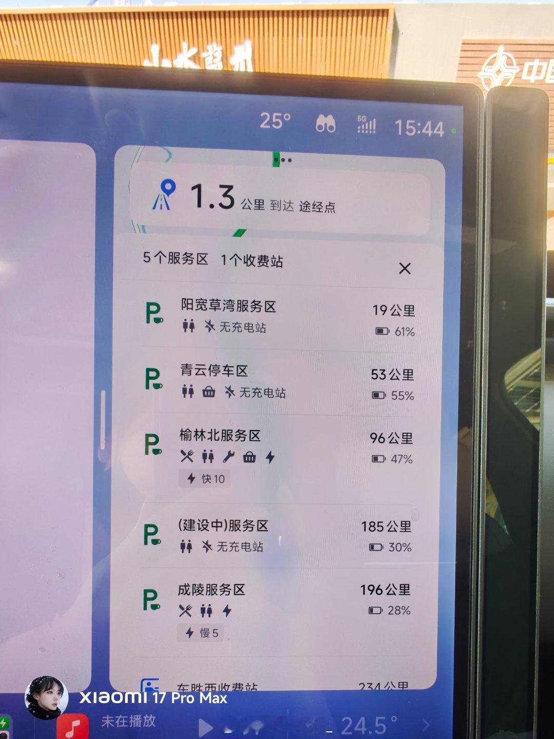 昨天开YU7 Pro 从山东烟台到山西临汾隰县跑了1000多公里,11个小时上午去了小西天(千佛庵)下午开车去鄂尔多斯,总行程大约500公里,5个小时29分钟已经开了3个小时,一路上在听雷总直播,现在到了榆林的佳县服务区休息一下。YU7 Pro 能耗还是非常强的,一路上服务区很多,充电非常方便。不过有一些服务区会明确标注不能充电,还是需要做好规划。这样随时补能,还是没有焦虑的,尤其是这种相对偏僻一点的高速环境。不过沿途风景真的很美。小米汽车雷军直播小米汽车小米yu7 榆林·佳县