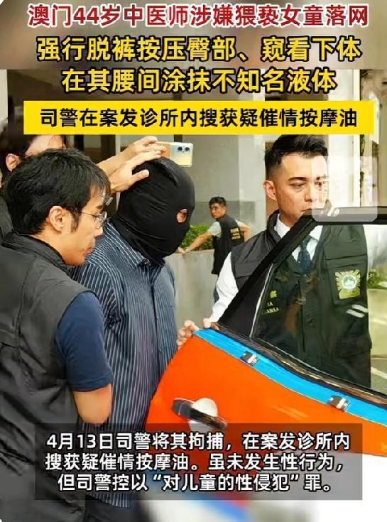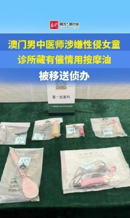 司警接到报案后迅速展开调查,于4月13日下午对涉事诊所进行突击搜查,当场拘捕了44岁的杨姓中医师,并在现场搜获多支疑似催情用途的按摩油等犯案工具。经警方初步调查确认,涉案中医师并未与受害女生发生性行为。杨某在澳门已执业17年,涉案诊所也开业至少七年。司警以“对儿童之性侵犯”罪将其落案起诉并移送检察院侦办。