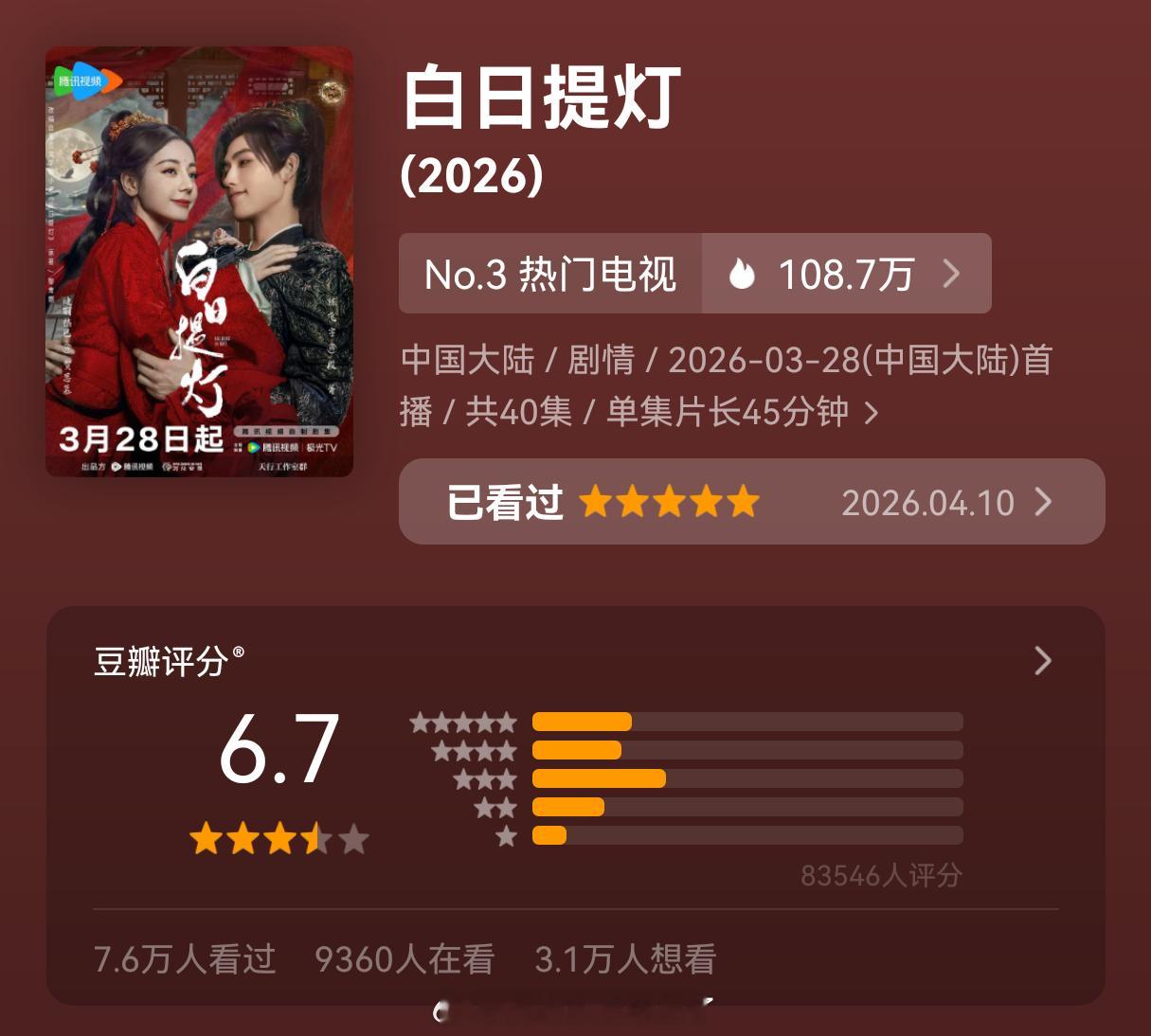 迪丽热巴《白日提灯》豆瓣开分6.7分,打分人数8.3w人,又是一样的分型,一点都不难猜是谁家恶意评分,大家走过路过帮忙去打个五⭐啊!!!