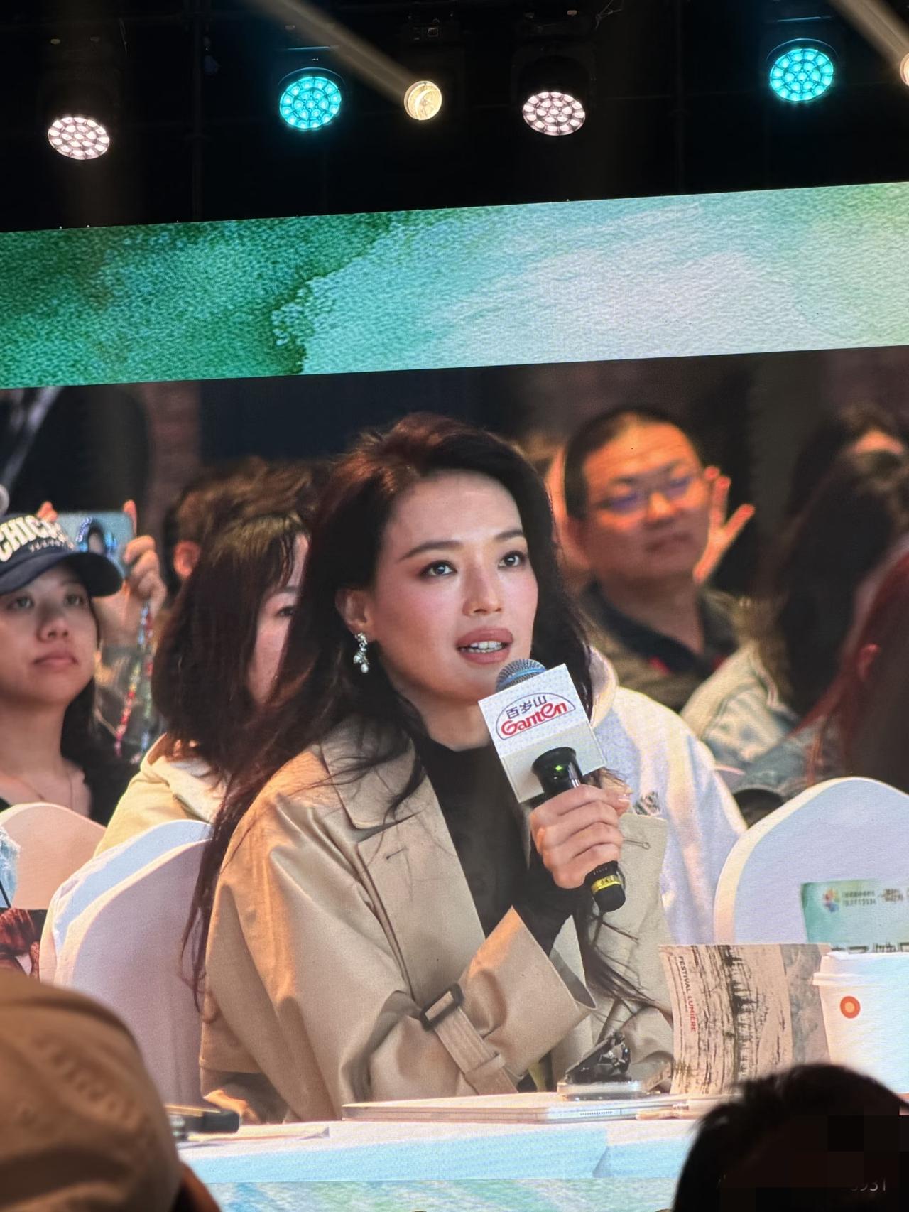 舒淇进场刚开始穿了一件米咖色的风衣外套,歪头坐在那里,一看就气场很好。