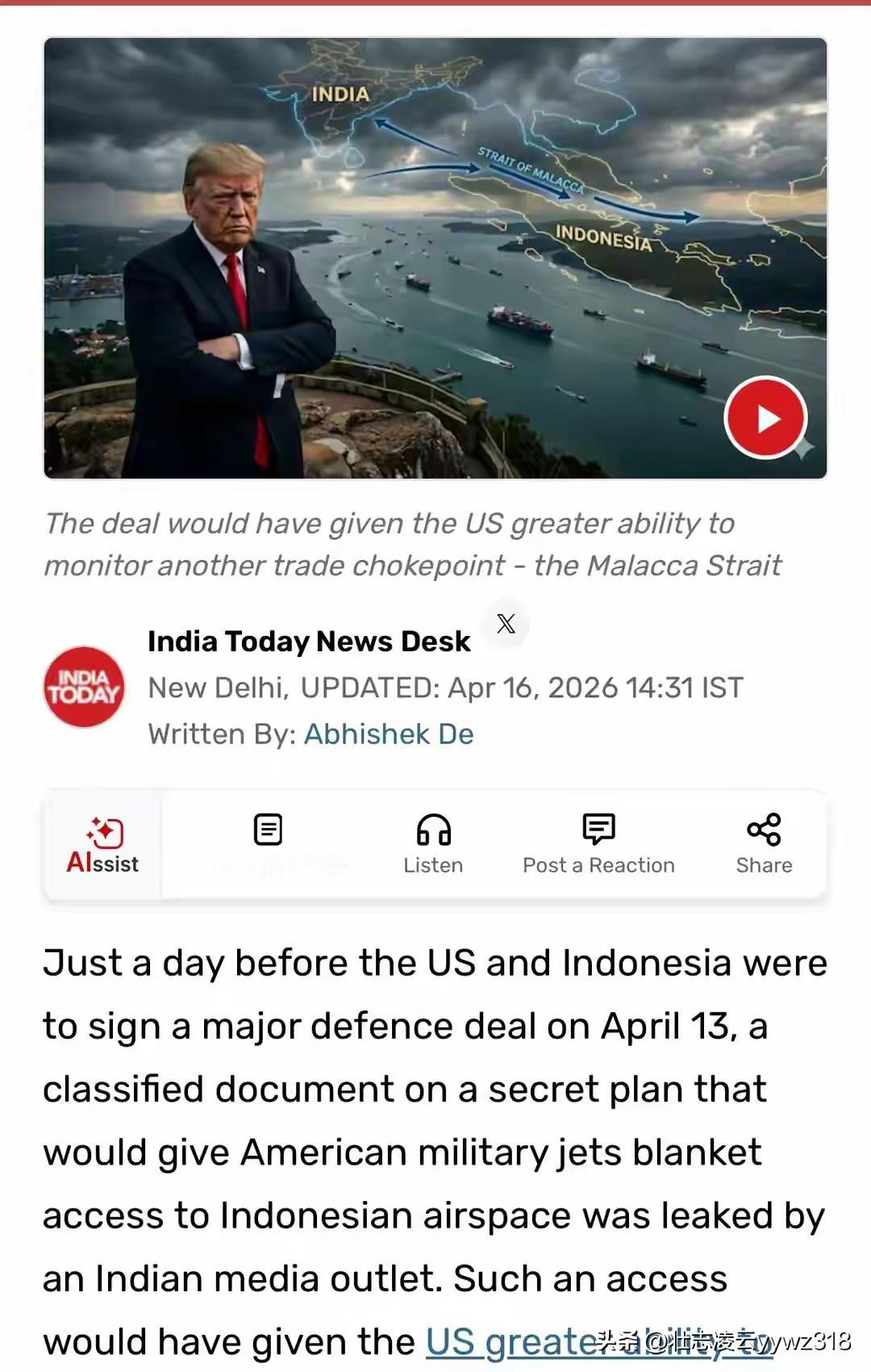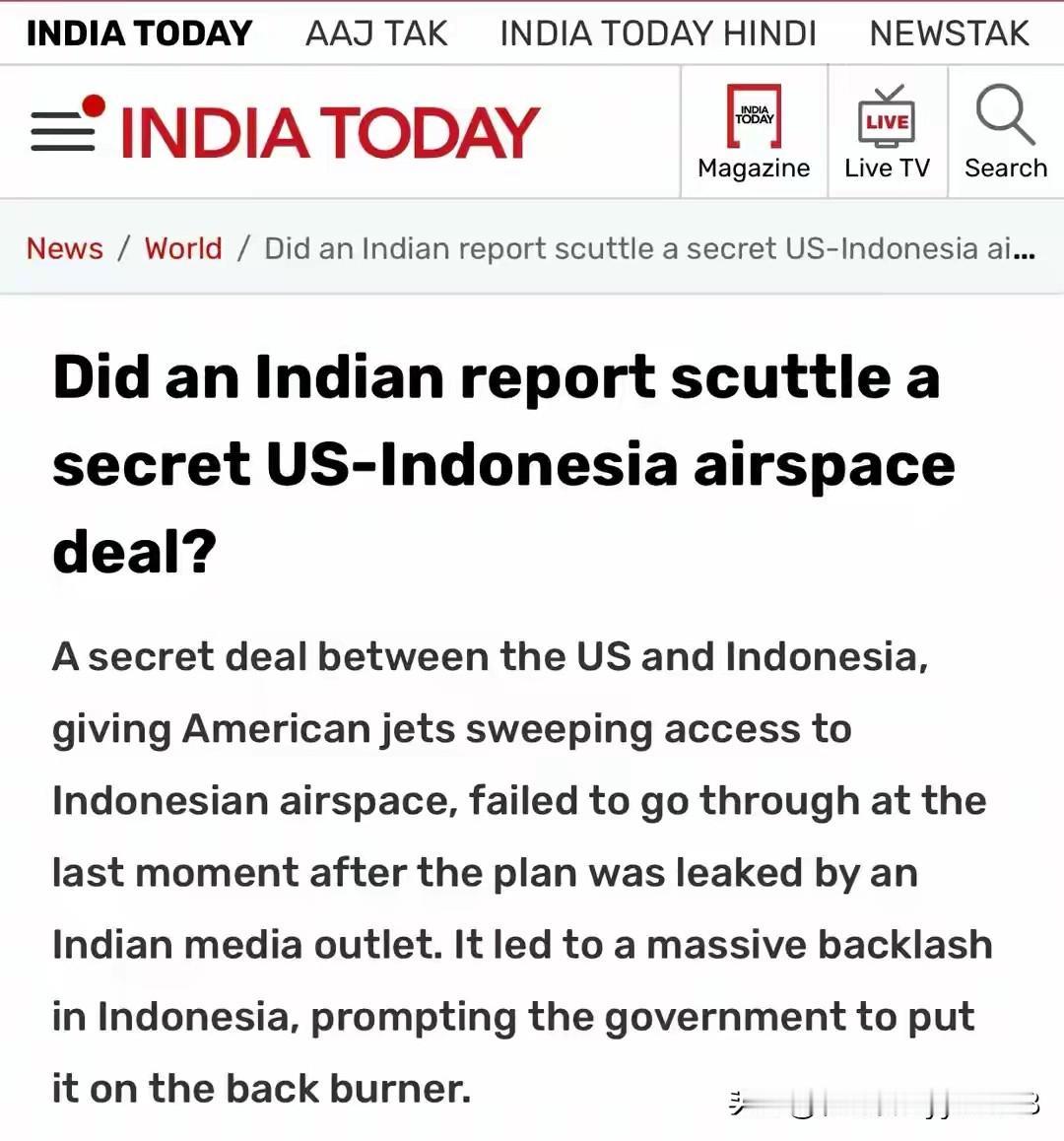 印媒4月16日爆料,美印尼原计划4月13日签署秘密防务协议,美方要全面飞越印尼领空,紧盯全球贸易要道马六甲海峡。就在签署前一天,机密文件遭曝光,印尼国内舆论炸锅,协议直接搁置。