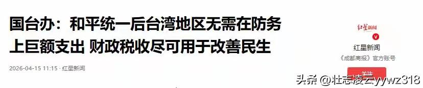 4月15日国台办明确表态,两岸和平统一之后,台湾不必再耗费巨资用于防务,财政资金可以全部投入民生建设,用于医疗、教育、养老等百姓切身相关的领域。