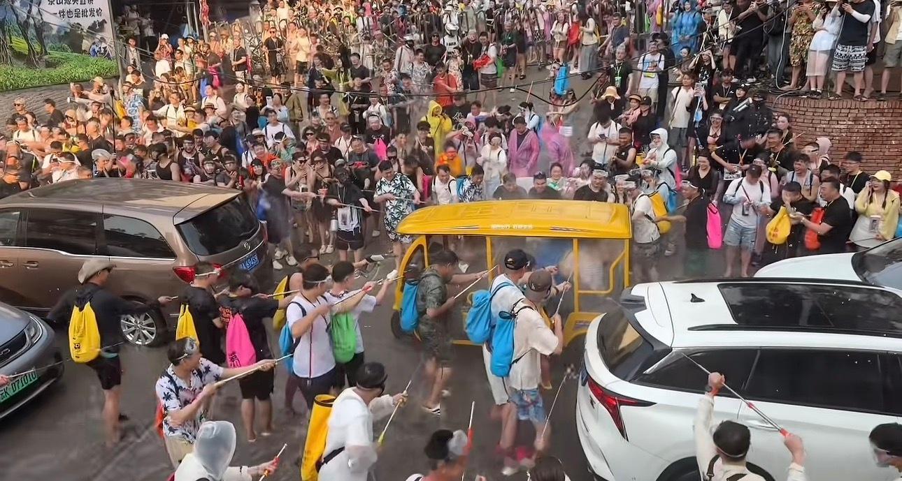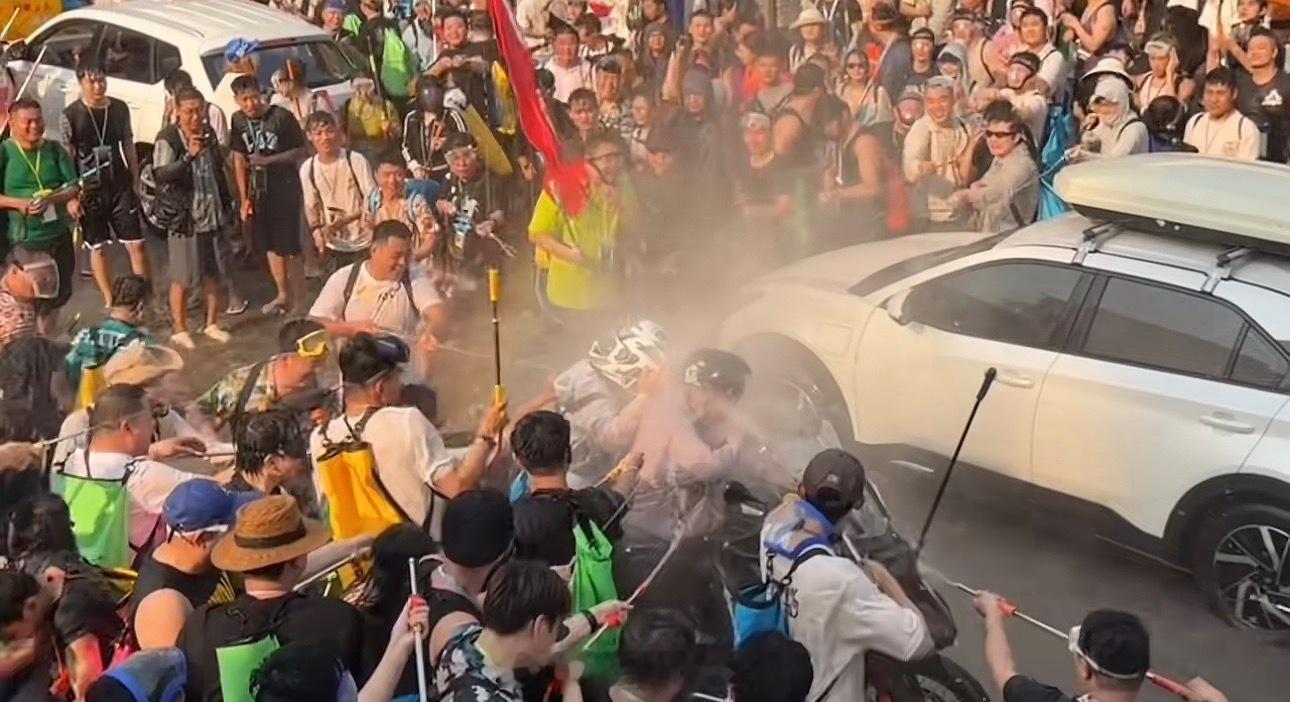 氧化菊 泼水节真的很过分欸、这是泼水节还是变相的8️⃣0️⃣节啊、把人后备箱打开喷、头盔摘下来喷、最过分的是一帮男的欺负两个女孩子是在搞什么呢?
