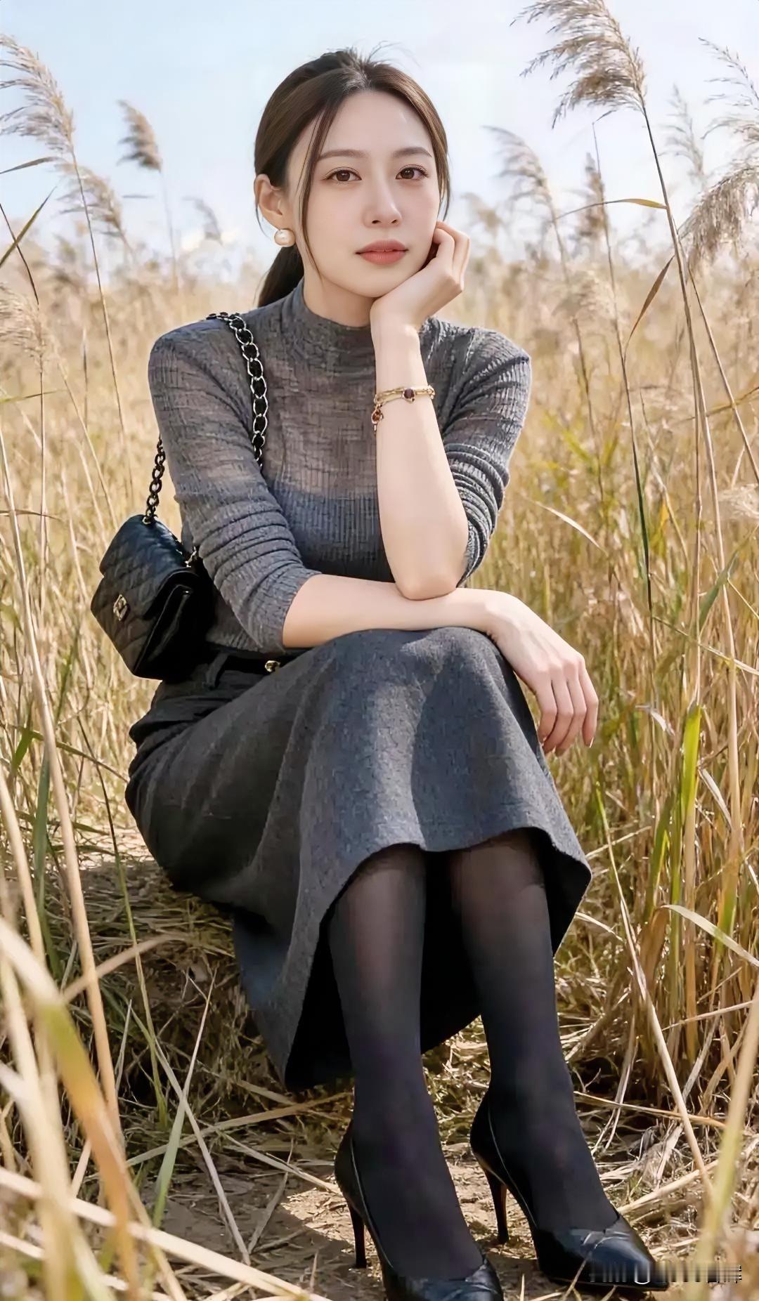灰裙如雾,轻笼秋日芦苇的温柔。 黑丝曳地,与高跟共谱优雅韵律。 她坐田埂,手