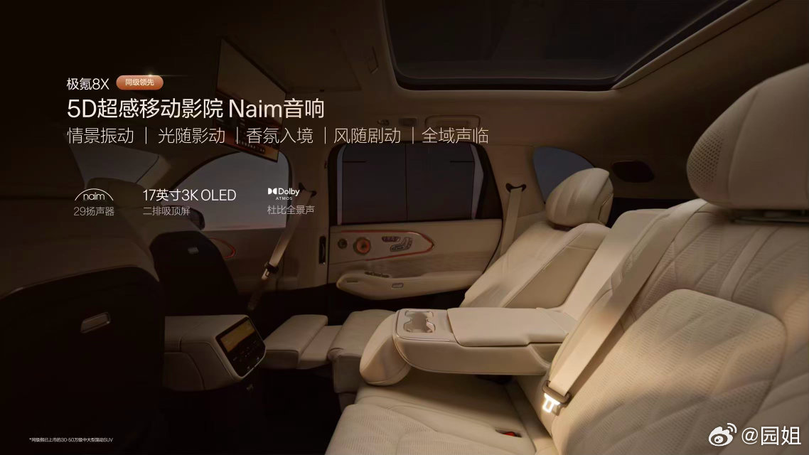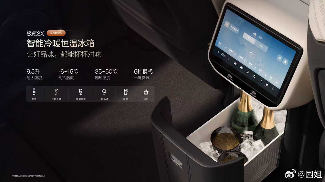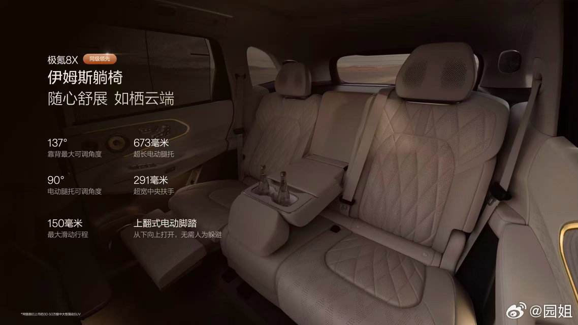 极氪8X 同级最豪华的伊姆斯躺椅,同级唯一的5D超感移动影院,同级最强智能冷暖恒温冰箱。价格35.68起~