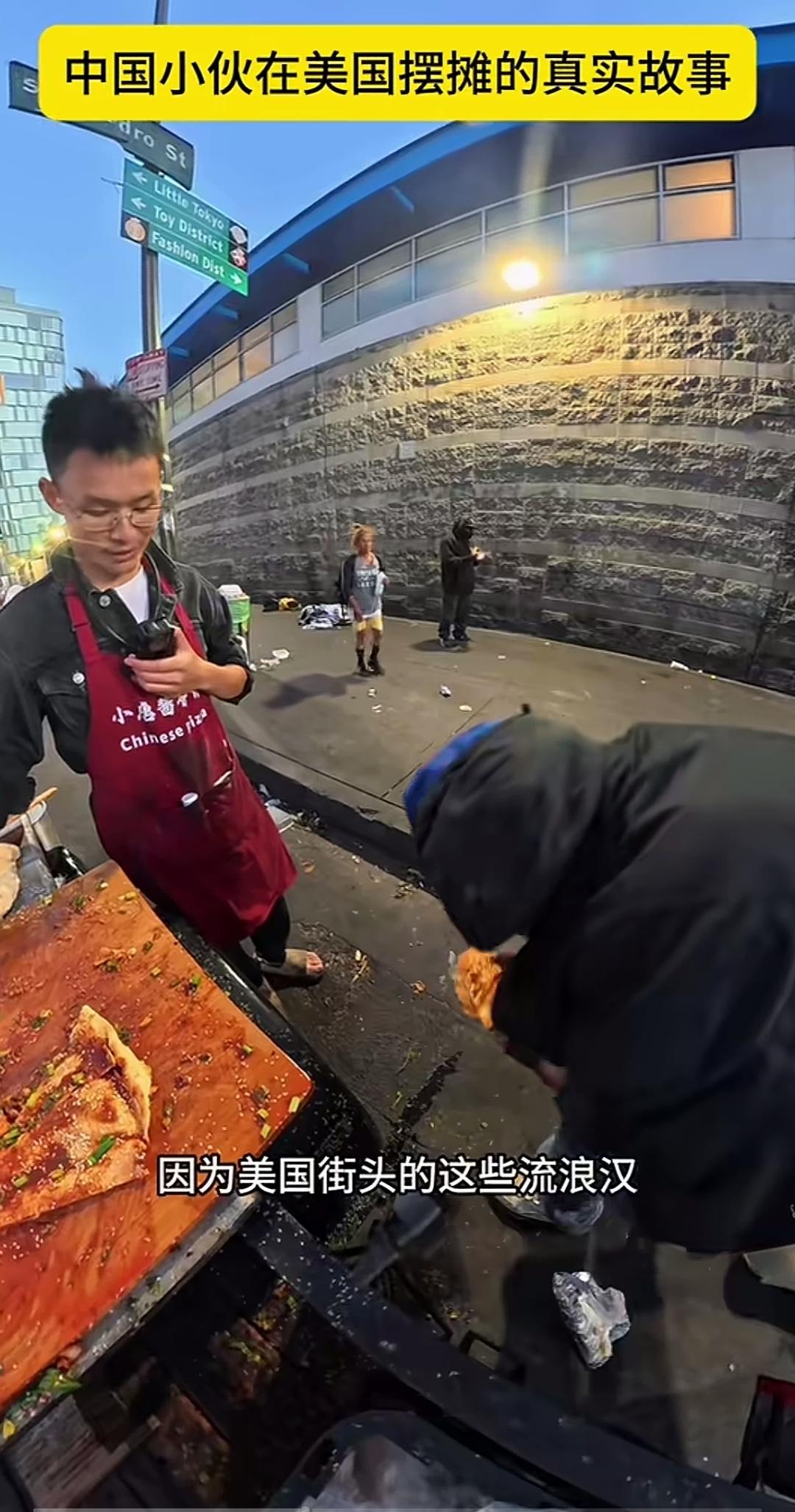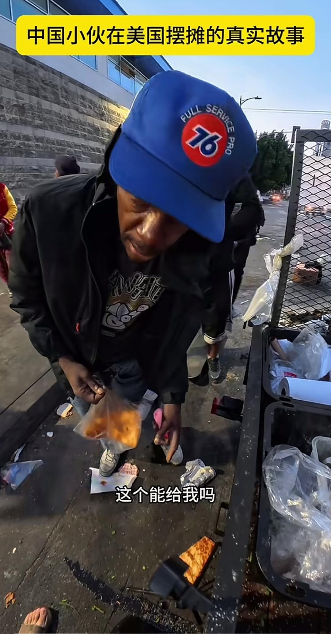 一位中国小伙在美国,专门做酱香饼,送给美国流浪汉。一不小心一块酱香饼掉地上了,他又重新拿了一块给一位黑人大姐。