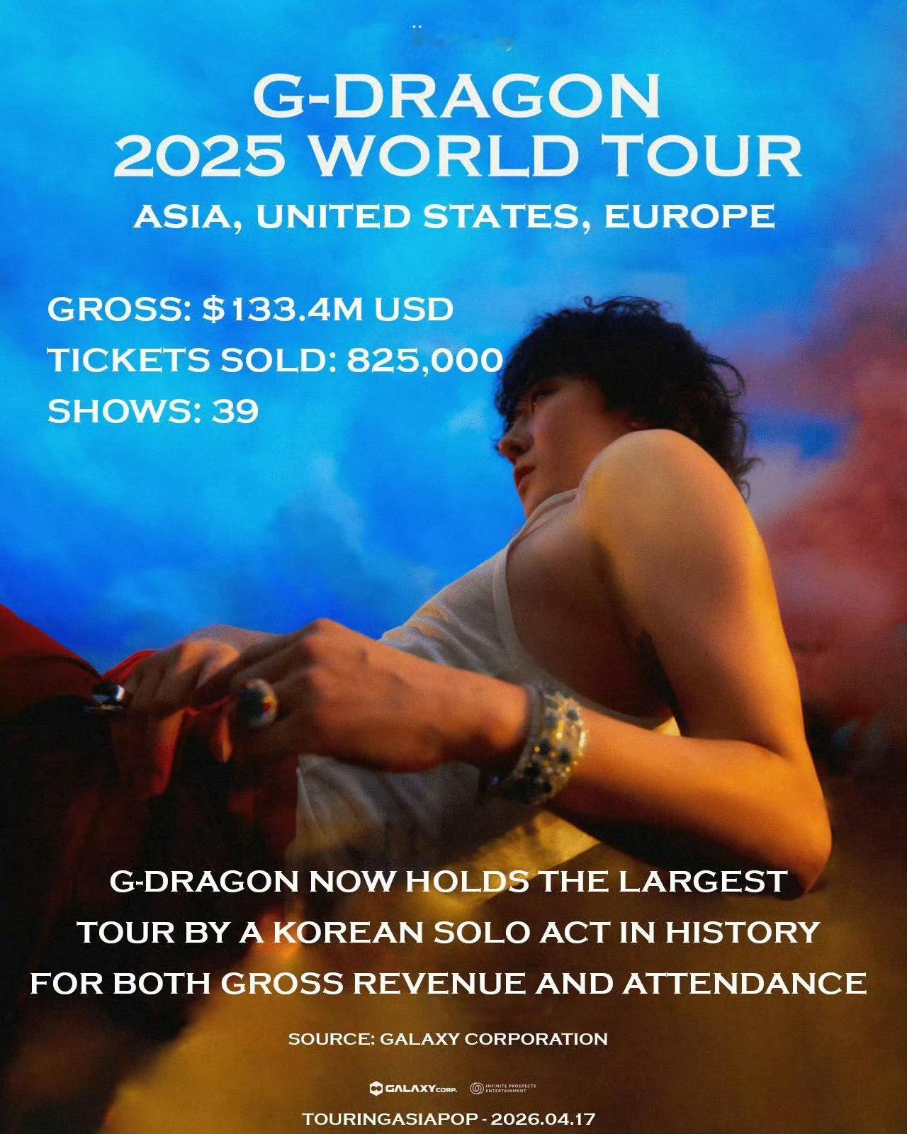 权志龙巡演票房过亿 权志龙巡演票房1.334亿美元(折合9.1亿rmb),成为kpop第一个巡演票房过亿的solo歌手✨