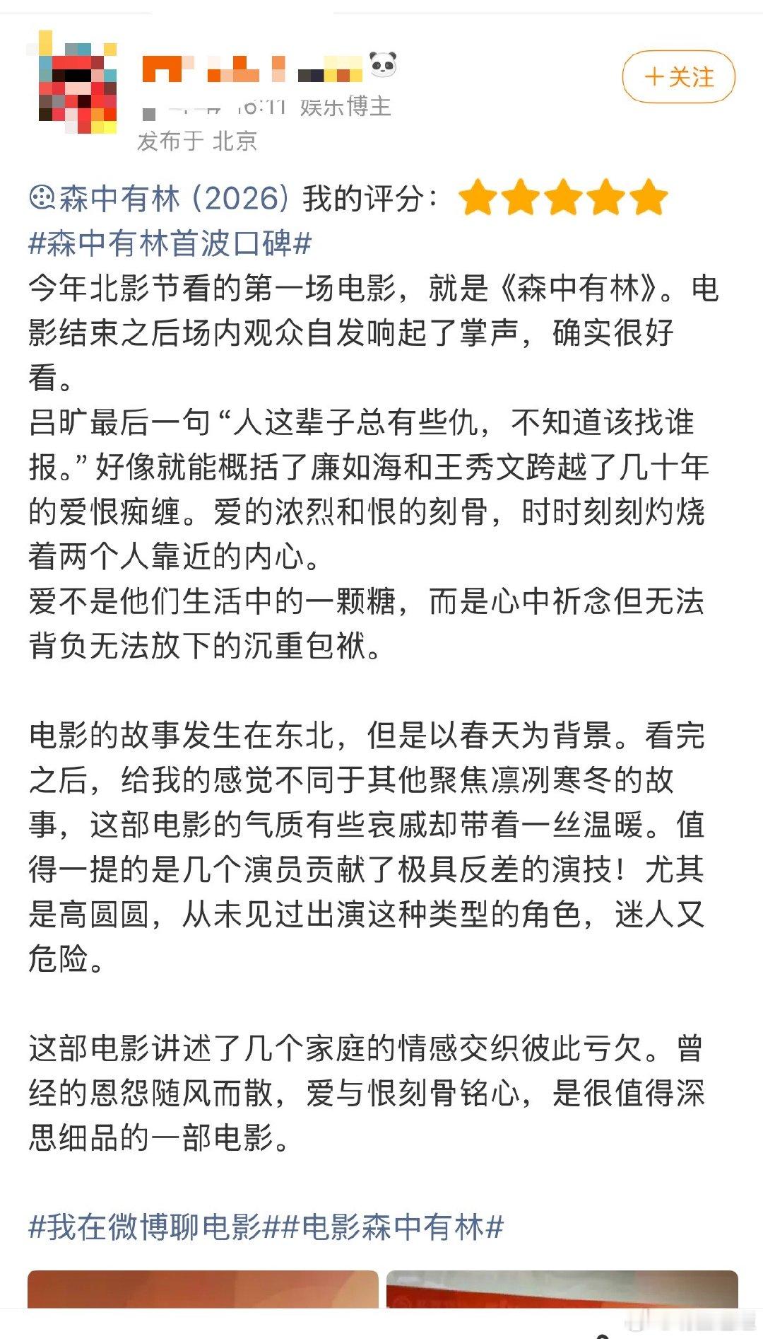 森中有林首波口碑跳出套路的诗意犯罪美学!《森中有林》以密林喻人心,把血色与浪漫拍得极致迷人。于和伟沉稳戳心,高圆圆告别温婉演复杂女性,全员演技在线。生猛、酸涩、后劲绵长,天坛奖入围实至名归,五一影院相见。