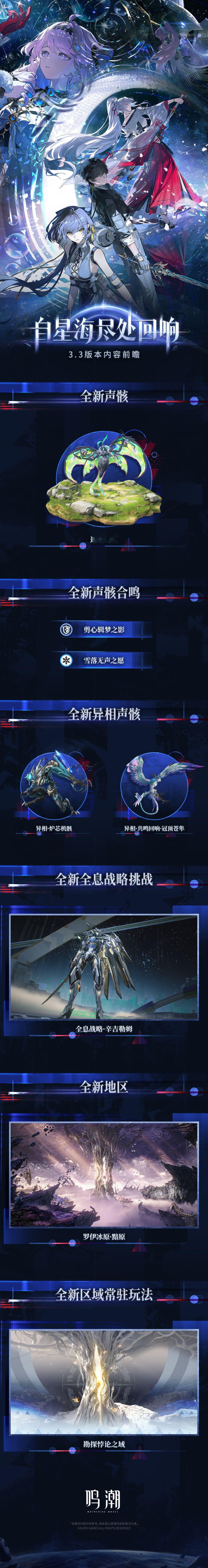 鸣潮二周年潮声庆典鸣潮3.3版本前瞻鸣潮3.3版本 鸣潮带着他的周年庆版本来了! 可以直接免费获取50抽,诚意满满了!冰系主C绯雪颜值战力双在线,粉切黑少女达妮娅也无法拒绝,两位新角色我也都全都要! 鸣潮鸣潮