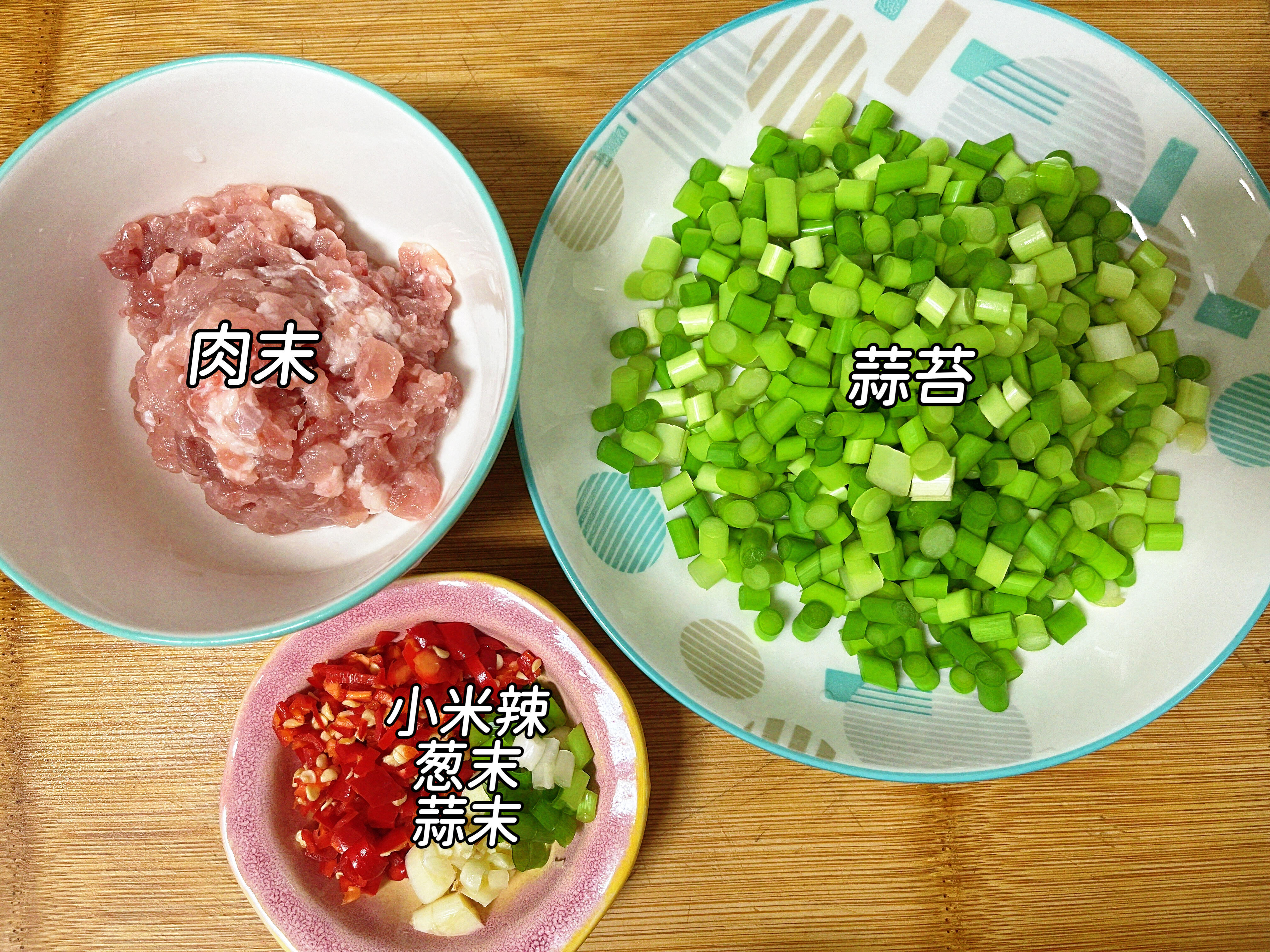 蒜苔、猪肉末、蒜末、葱花、小米辣(可选,不吃辣可省略)