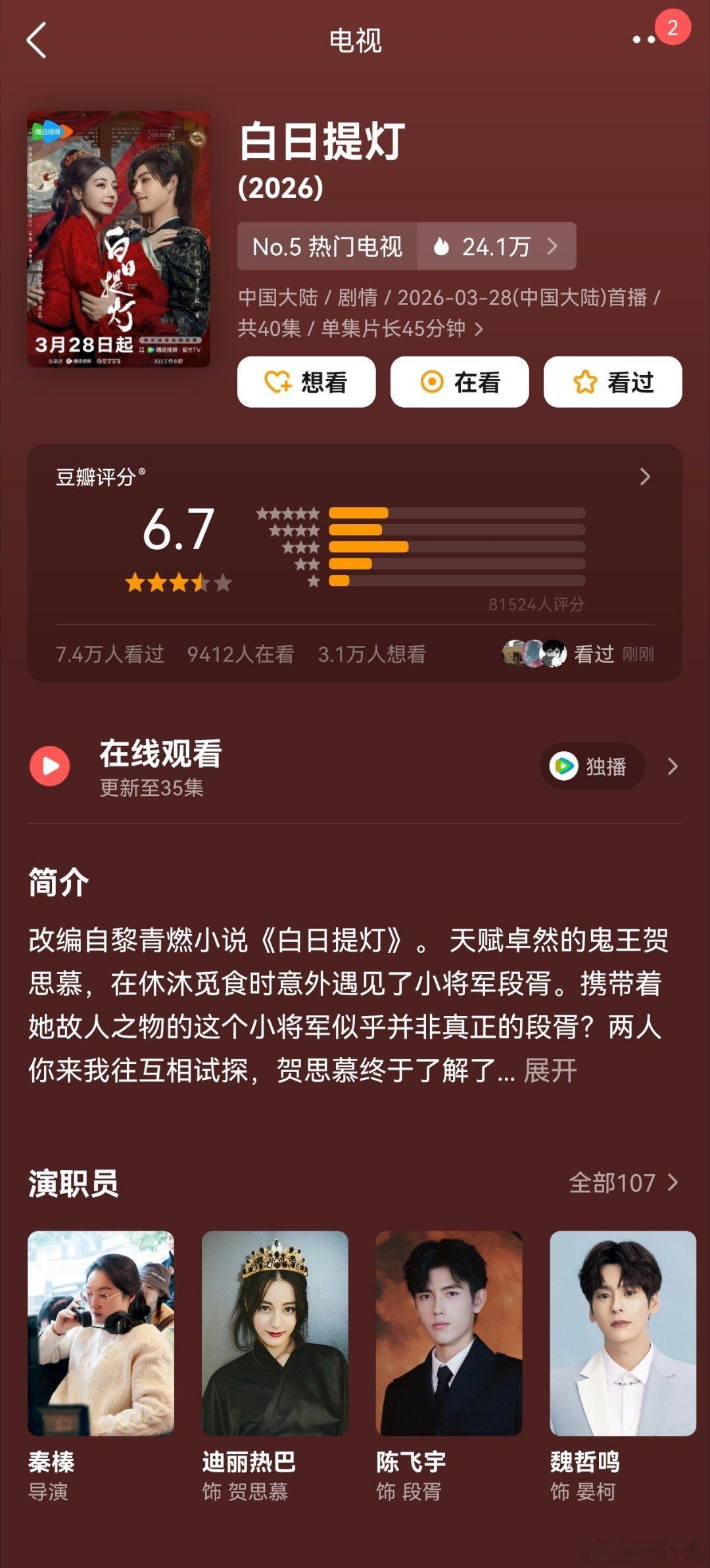 鹅今年播了好几部古偶,谁能想到迪丽热巴陈飞宇白日提灯拿到了目前是2026腾讯古偶