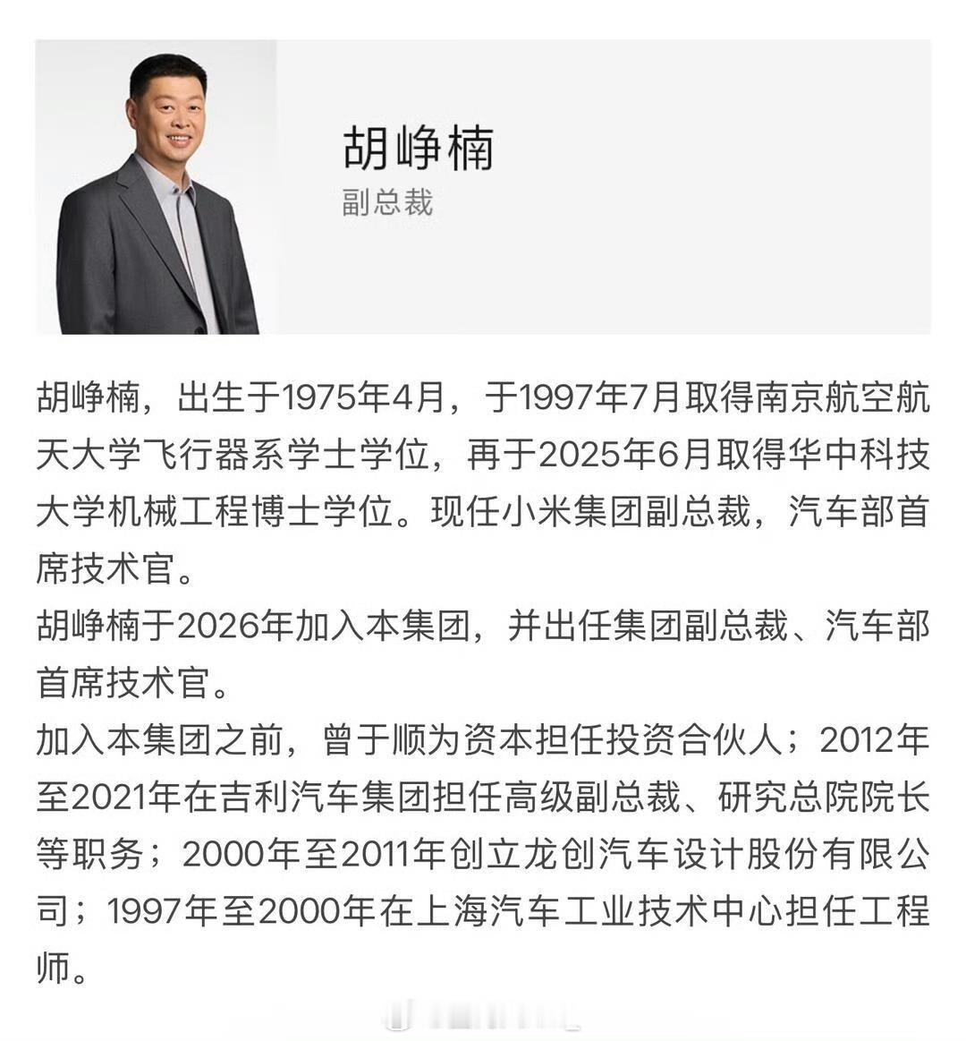 胡峥楠出任小米集团副总裁从SU7到YU7连续爆款,小米汽车已经证明自己能造出好开、好卖的车。随着胡峥楠、宋钢正式加入小米,小米汽车顶级造车天团,全面成型!强者云集,良将如云!还有近期入职的安全负责人侯景雷,以及大家熟悉的李田原、任周灿、叶航军等核心骨干,研发、制造、安全、战略,各条线都有顶级大佬坐镇。据说小米研发团队已经超过一万多人,其中研发就将近一万人。舍得在人才和技术上长期投入,才是长久造车的底气。作为车主和消费者,看着确实越来越踏实。胡总出身上汽体系,兼具创业与多车企爆款打造经验;宋钢深耕福特、上汽、特斯拉,吃透世界级车企管理体系。之前要有传闻,小米汽车在欧洲也招了很多大佬……