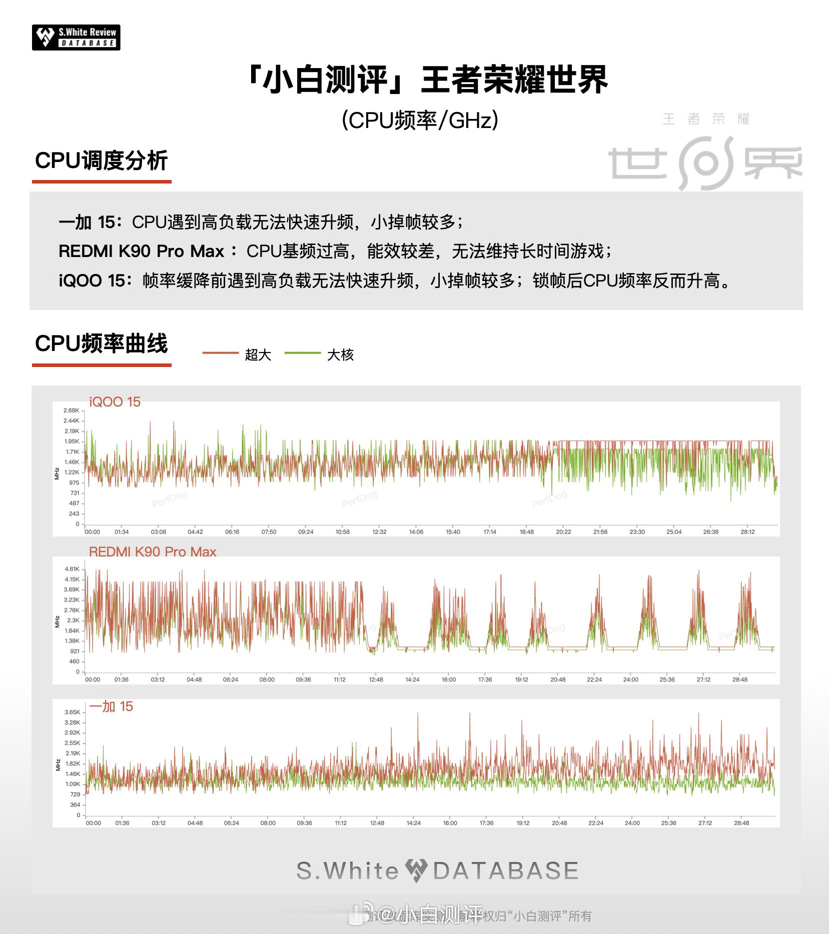结合数据和实际游戏体验进行分析,目前一加 15帧率最稳、综合游戏表现最好;iQOO 15在20分钟后由于机身温度升高,开始出现锁帧情况,游戏全程未降亮度;REDMI K90 Pro Max 14分钟表现优秀,但功耗过高,14分钟机身温度升至48℃后降亮度和帧率,游戏体验还有优化空间。