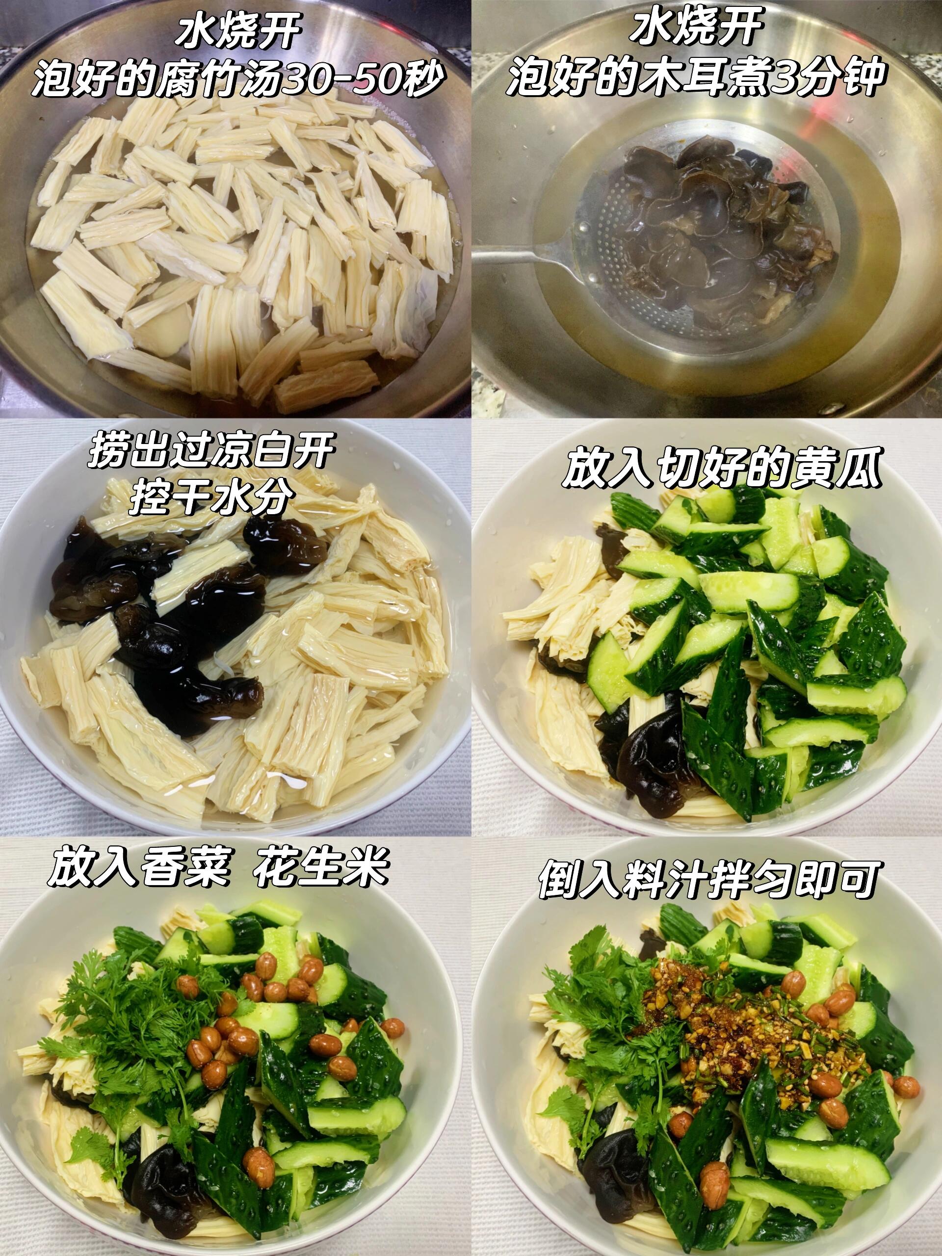4️⃣腐竹,木耳控出水分,倒入切好的黄瓜,香菜,花生米,倒入料汁拌匀即可