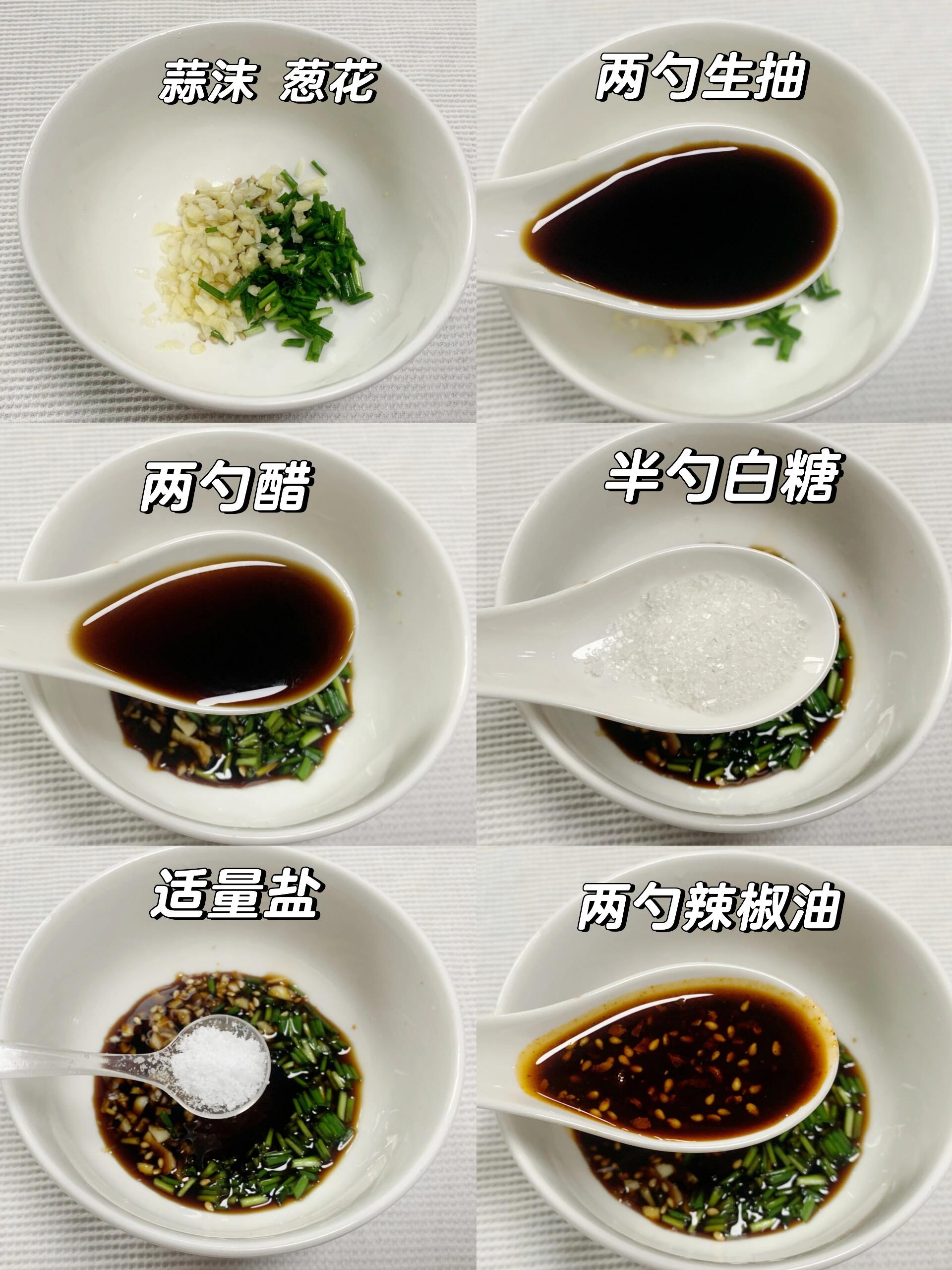 1️⃣调个汁:蒜沫 香葱,两勺生抽,两勺醋,半勺白糖,适量盐(根据自己口味来),两勺辣椒油,拌匀备用