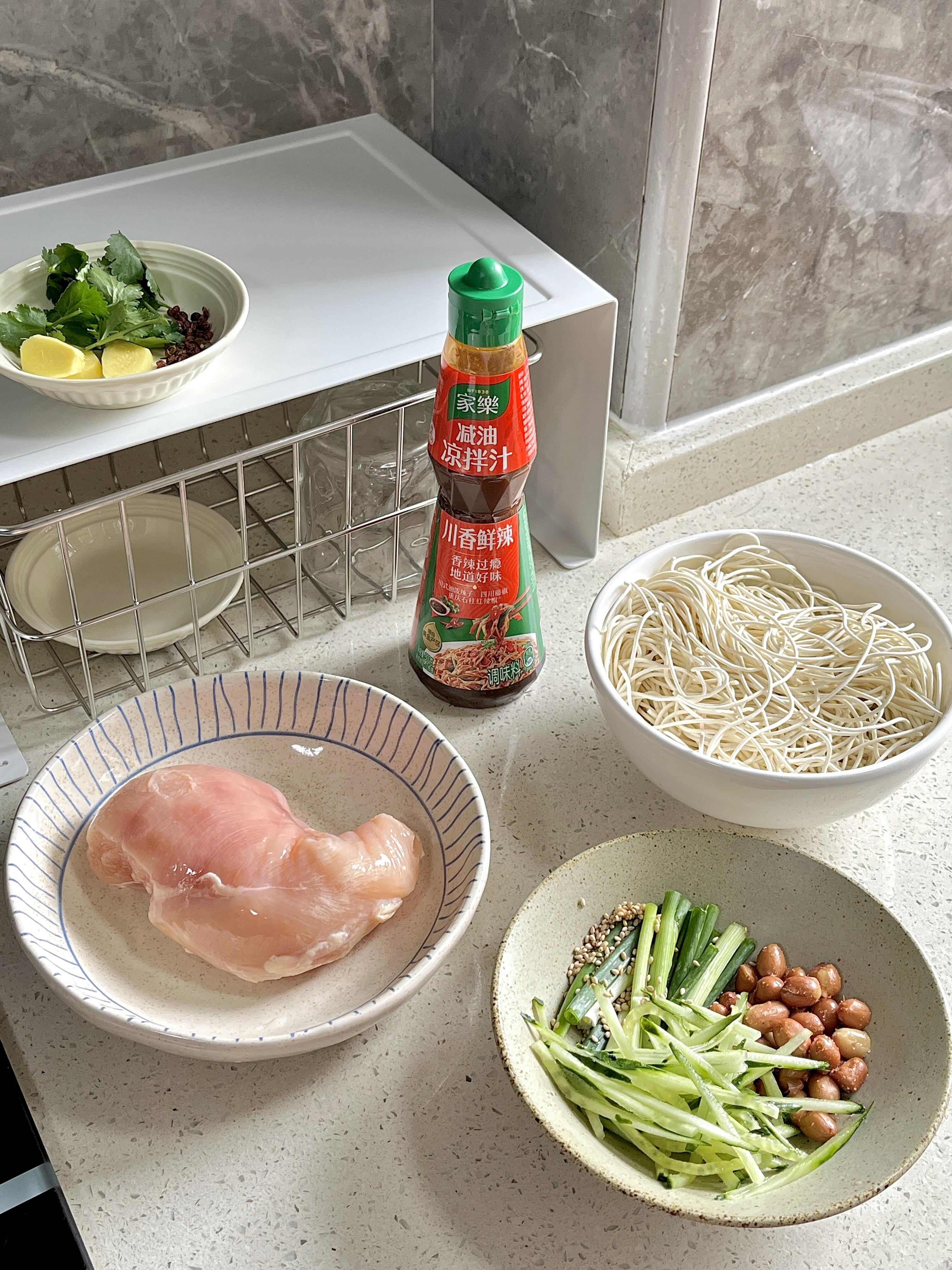 鸡胸肉、面条、黄瓜丝、花生米、葱蒜、香菜、芝麻、家乐香辣凉拌汁、花椒、葱姜