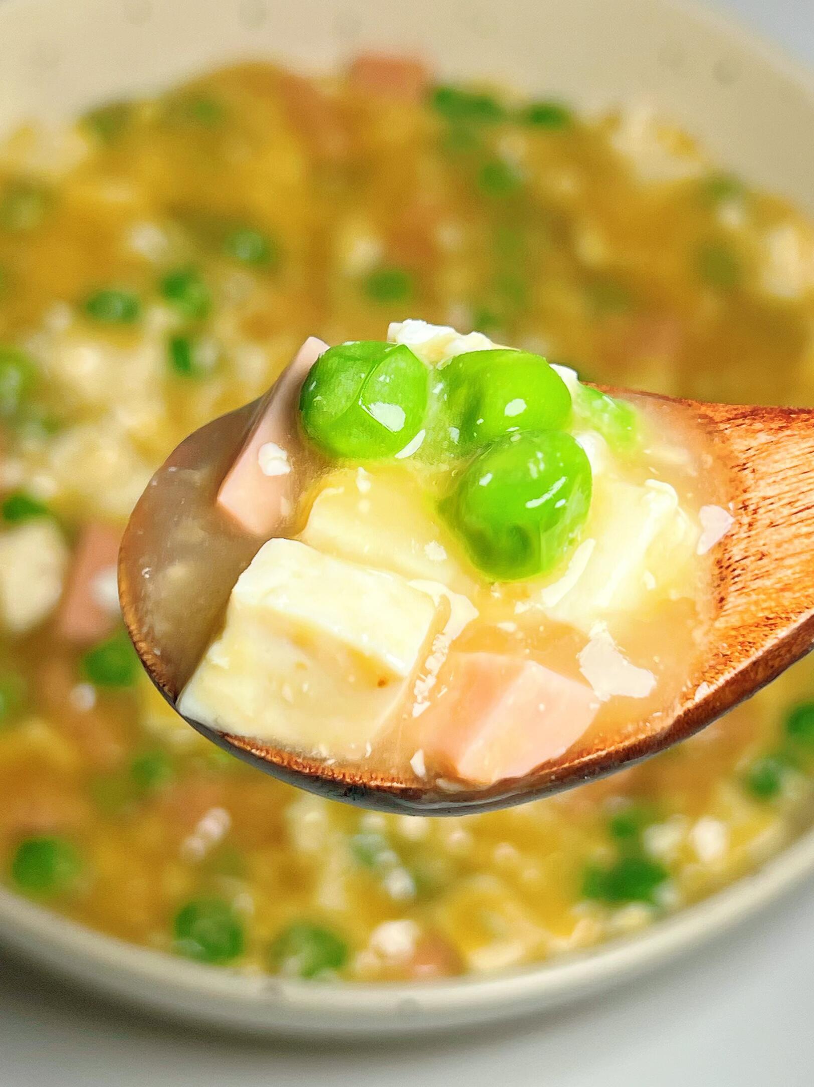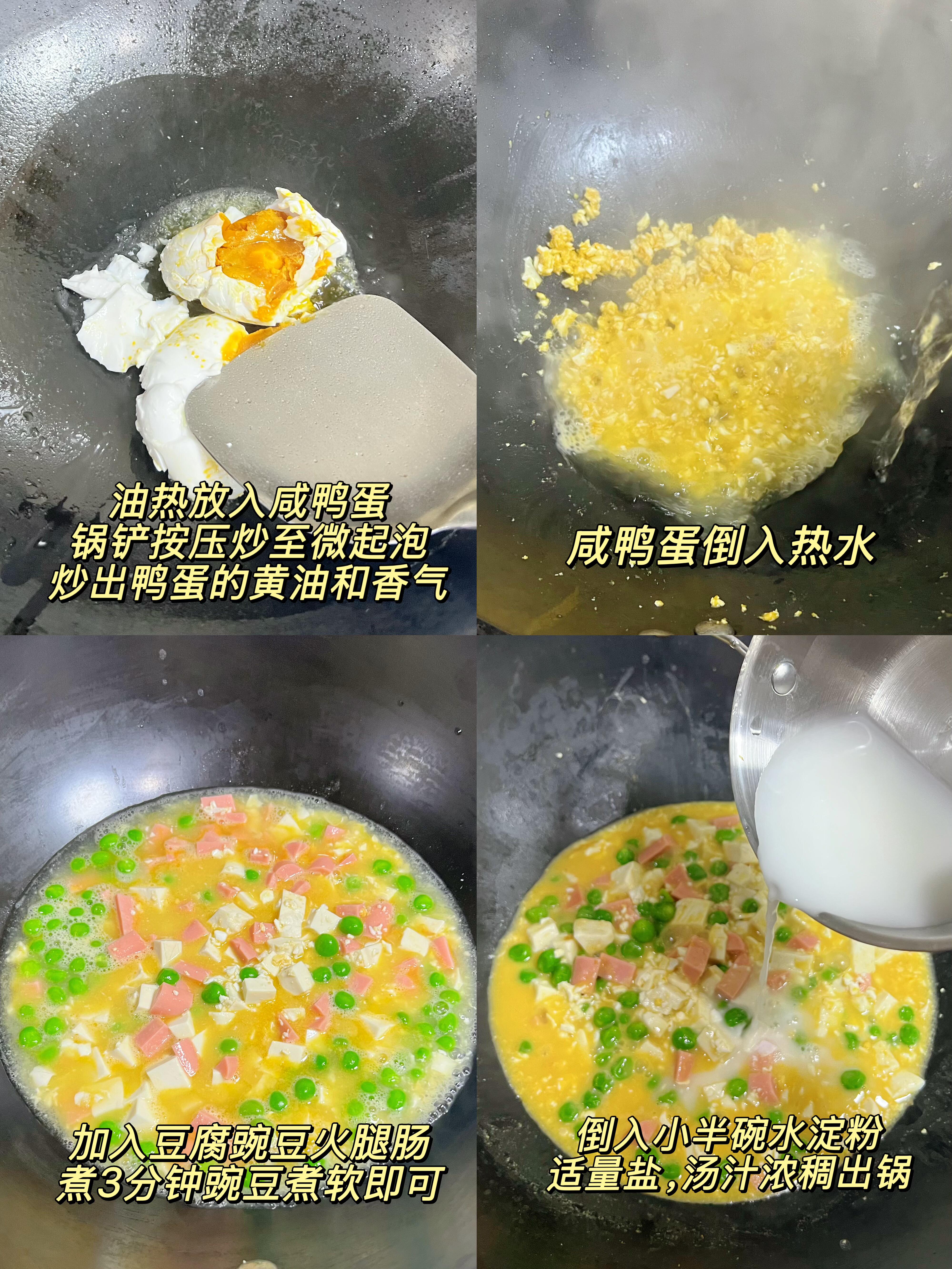 金黄流沙的蛋黄汤汁,裹着滑溜溜的嫩豆腐,软嫩中还带着豌豆的清甜、火腿的咸香,每一口都鲜到骨子里,拌米饭吃直接香到舔盘,关键做法巨简单,厨房小白也能轻松拿捏,零失败不翻车!