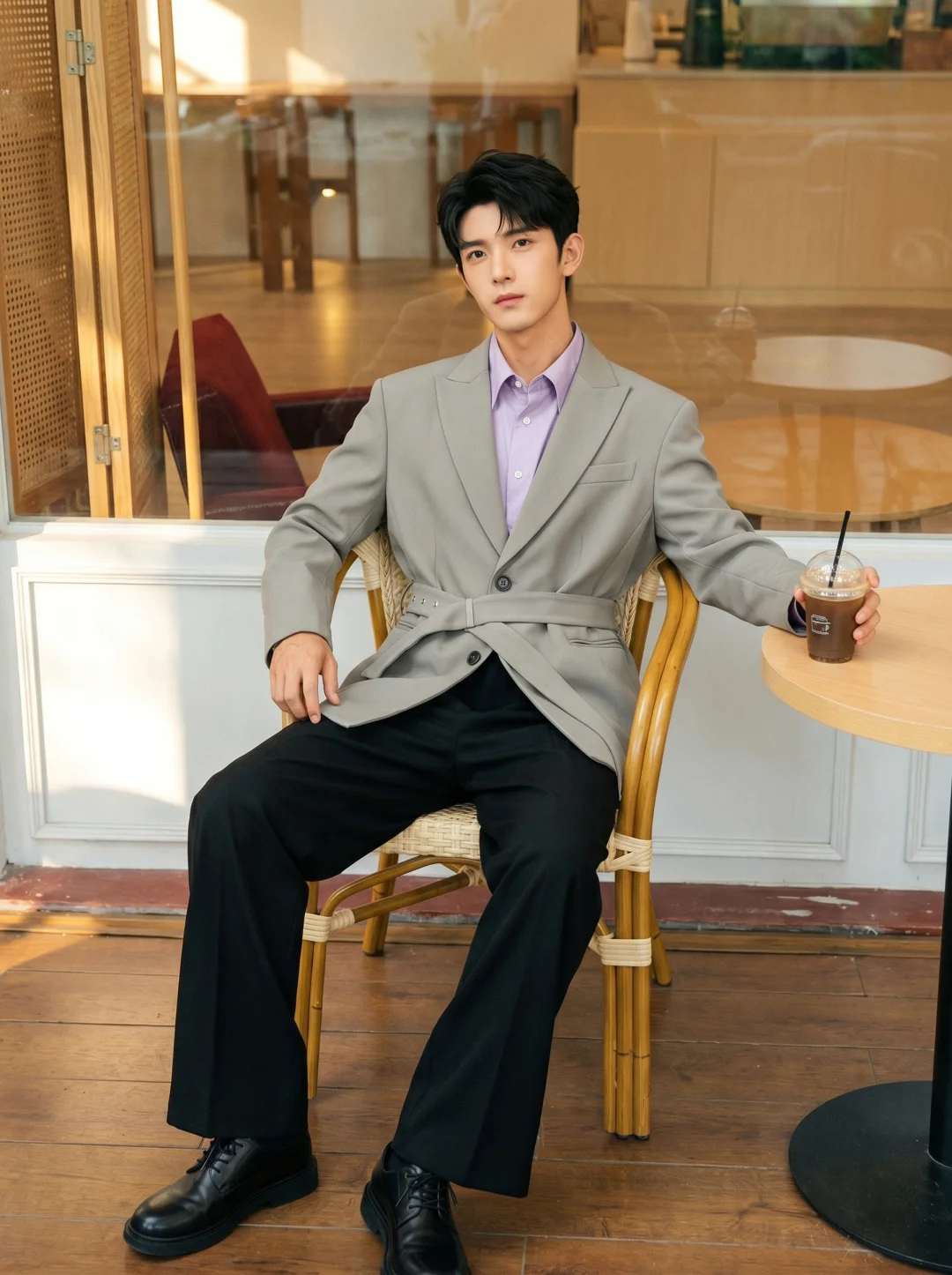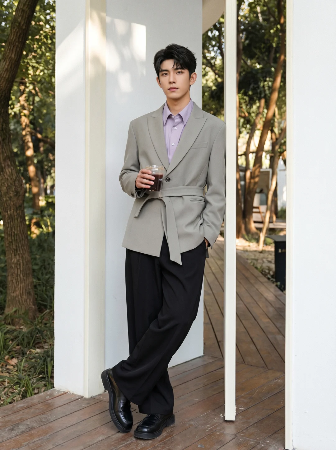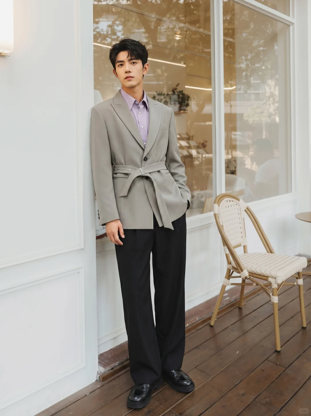 其实关键不在西装本身,而在那股“松弛的秩序感”。这套灰绿色枪驳领西装上身的一瞬间,我就知道这波稳了。很多人怕穿西装显得刻板呆滞,其实只要加一条腰带,把腰线提高,那种利落的比例感马上就出来了,甚至带点意式的高级颓废美。里面叠穿了这件莫兰迪紫衬衫,紫+灰的配色真的很有电影感,冷色调交织出的雅致感,完全没有那种局促,枪驳领自带气场,腰带设计直接打破了传统西装的沉闷。 灰绿与低饱和紫,不仅显白,还透着一种“读过很多书”的清冷感