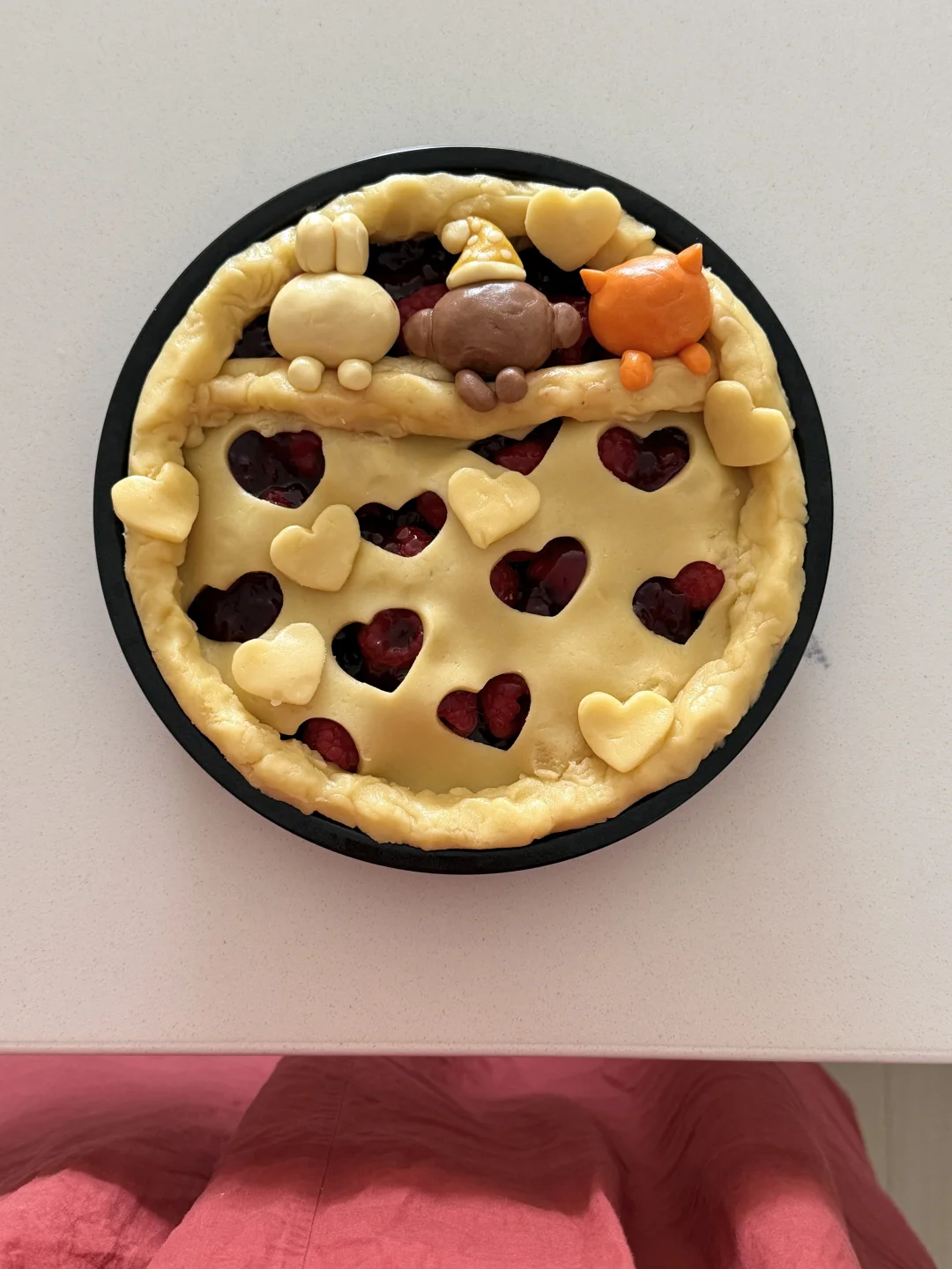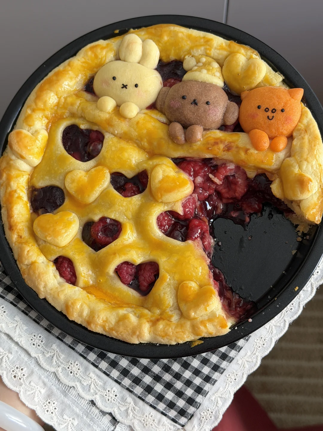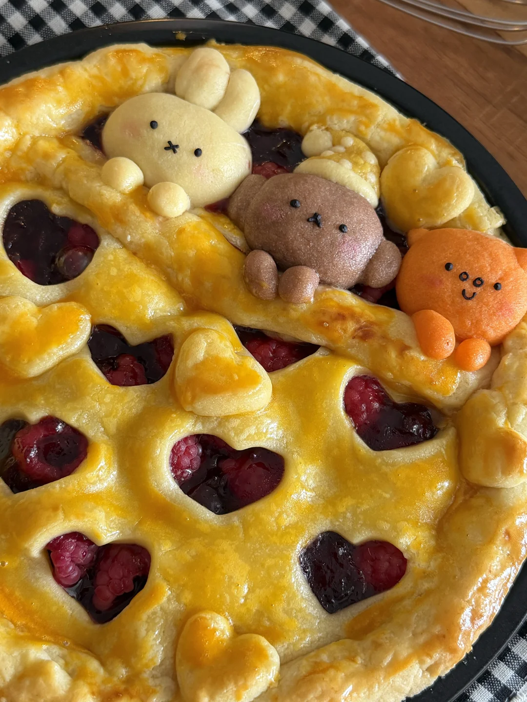 4️⃣取一小部分面团用可可粉,黄金芝士粉调色,捏出米菲鲍里斯和小猪波比。剩余面团擀平,用爱心模具压出❤️形状,盖在派🥧上,爱心小被子制作完成~