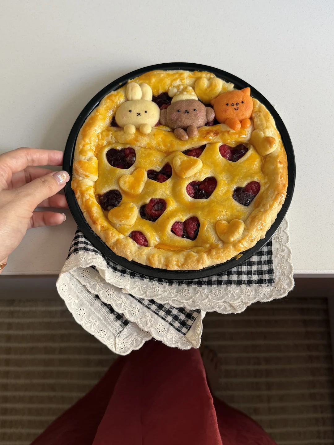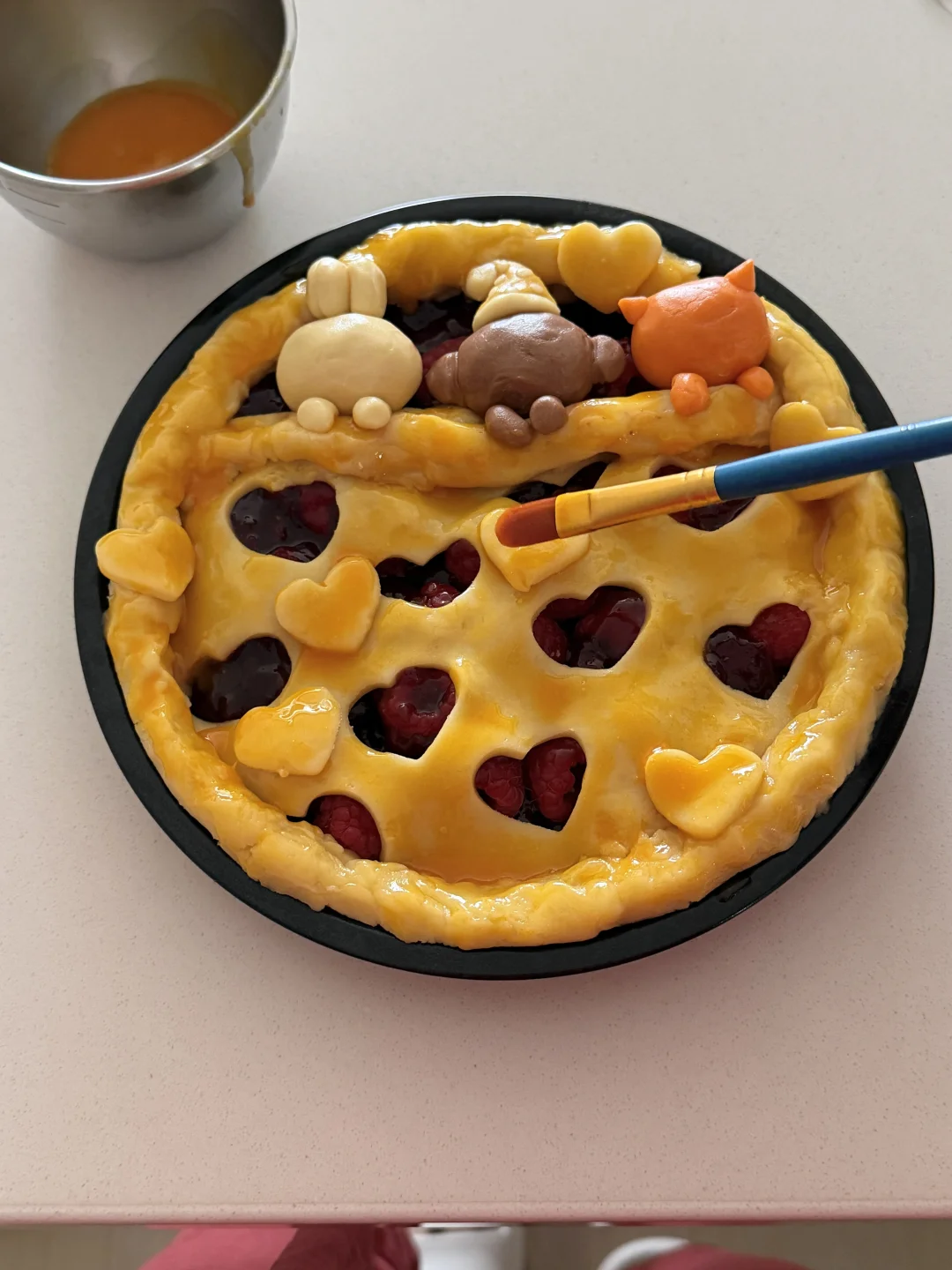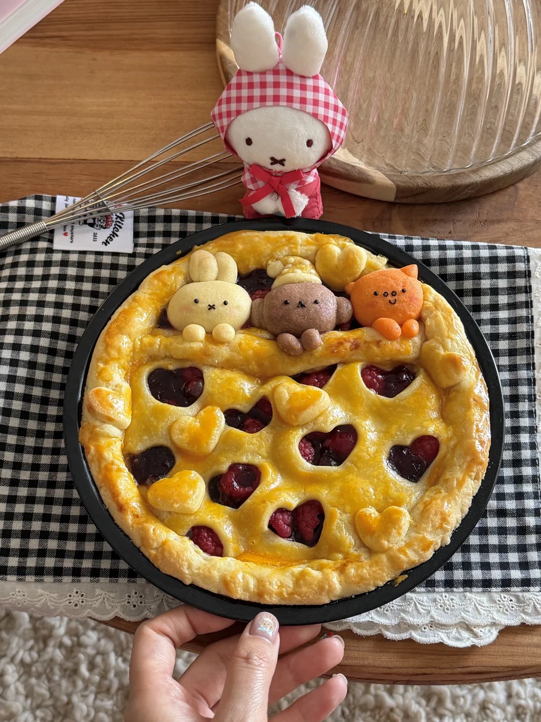 4️⃣取一小部分面团用可可粉,黄金芝士粉调色,捏出米菲鲍里斯和小猪波比。剩余面团擀平,用爱心模具压出❤️形状,盖在派🥧上,爱心小被子制作完成~