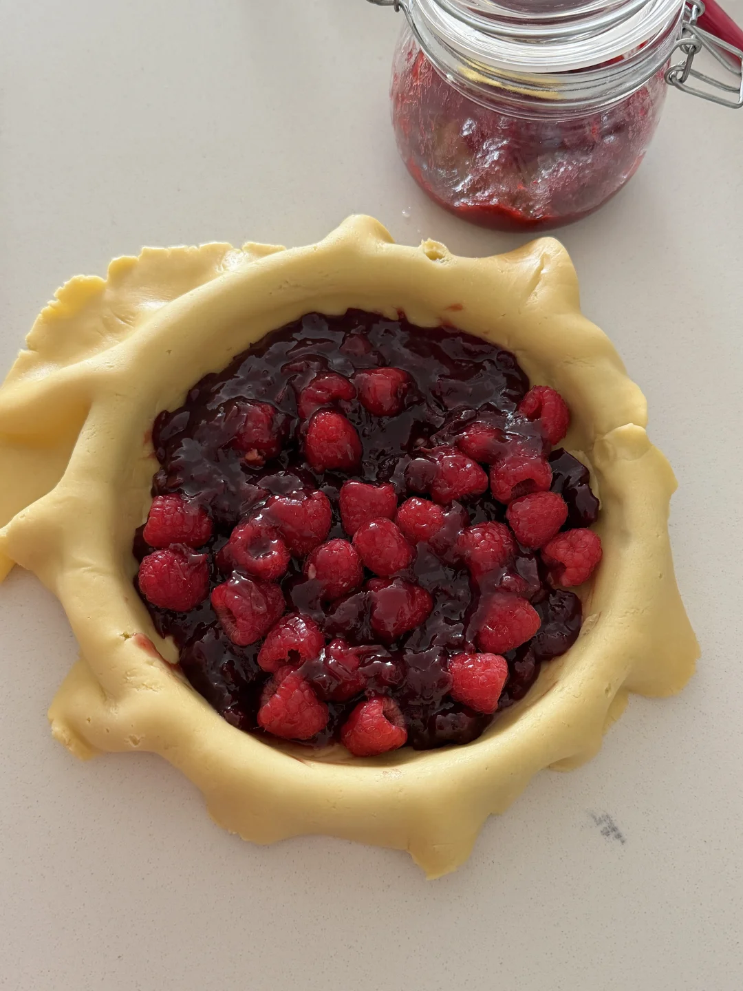 3️⃣取出面团,三分之一擀平放入模具中做派底,用小叉子扎小孔,加入自制樱桃酱和树莓